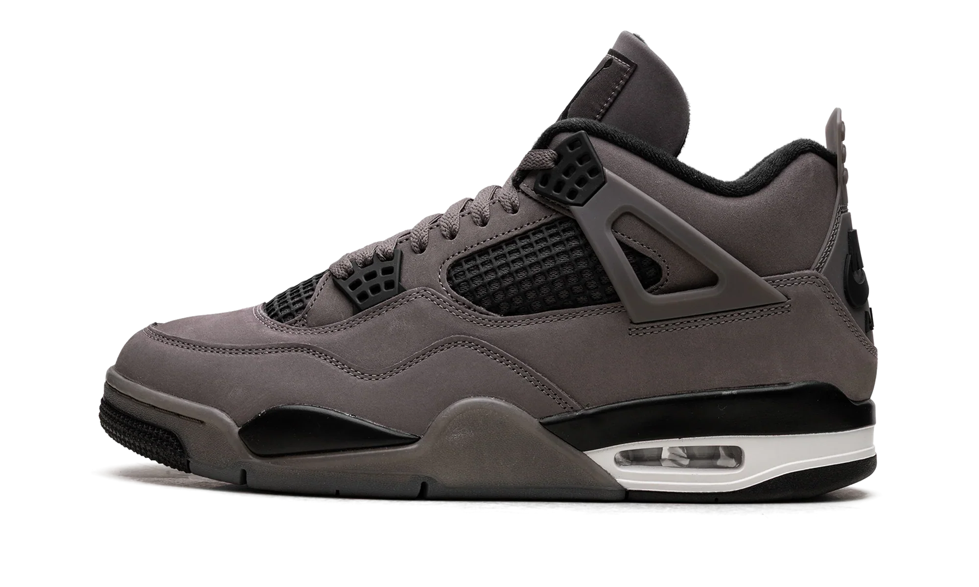 La tige se compose d’un suede Cave Stone riche et légèrement granuleux qui enveloppe l’ensemble de la silhouette. Ce ton minéral évoque la roche sombre et les textures naturelles, apportant une profondeur visuelle rare sur une Jordan 4. Les accents Black renforcent les éléments techniques du modèle, notamment les Wings, le filet latéral, les renforts du talon et les détails du midsole. Cette présence contrastée accentue la personnalité robuste et architecturale de la Air Jordan 4.