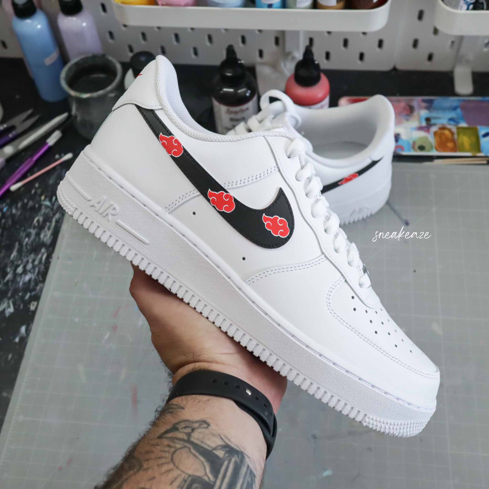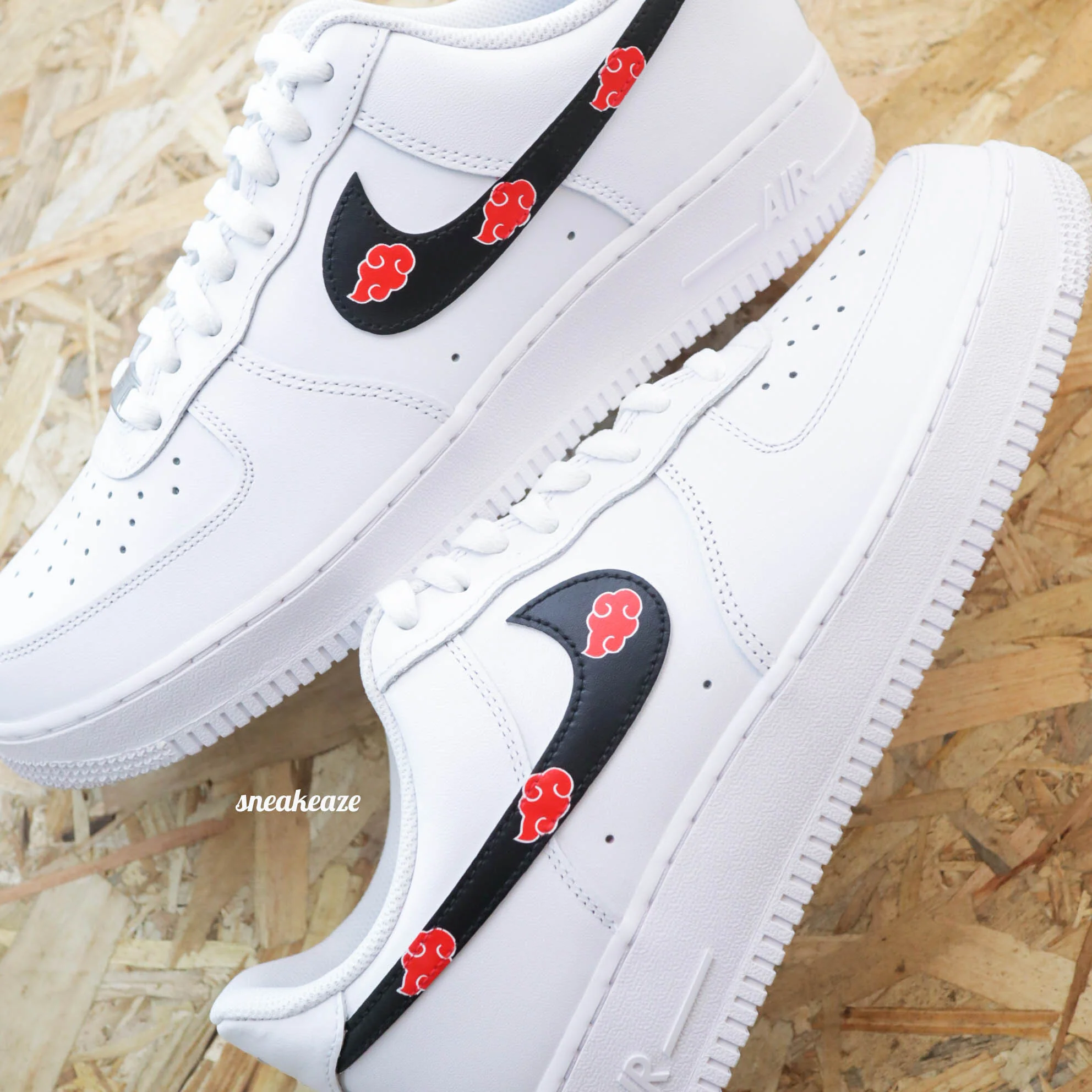 Baskets Nike Air force 1 custom motifs akatsuki sur les côtés extérieurs et intérieurs. Je souhaite ajouter un prénom à mon custom Modèle fait-main dans notre atelier, peinture waterproof. Le tarif comprend la paire ainsi que la customisation.