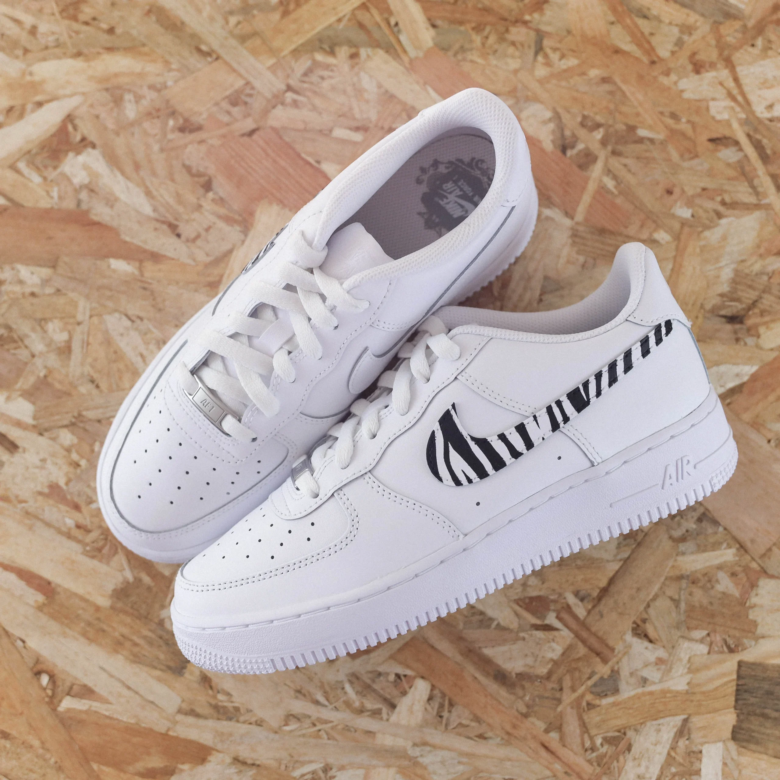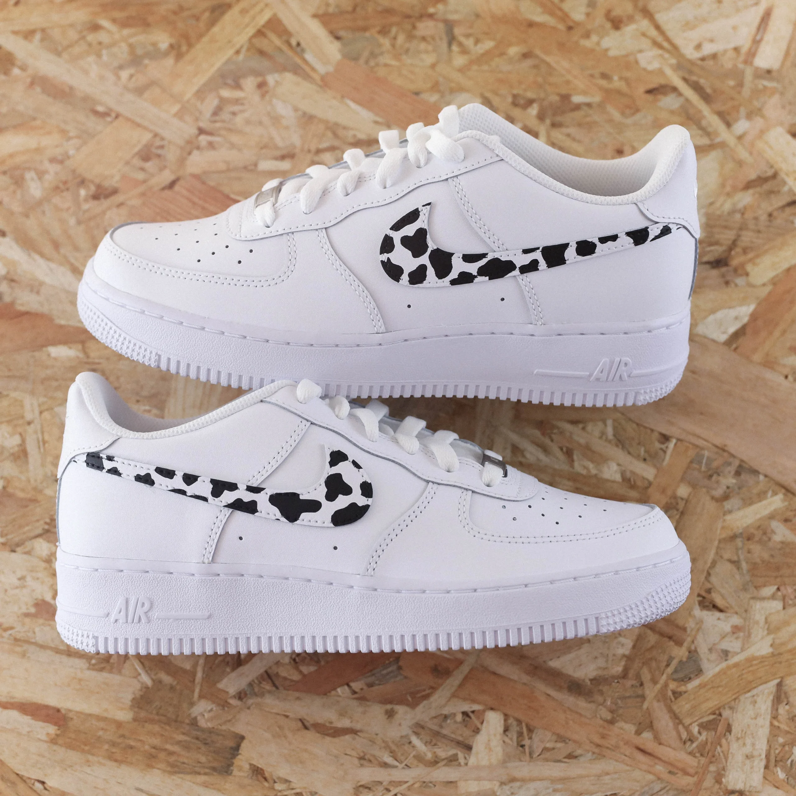 Baskets Nike Air Force 1 custom motif vache, les 4 signes nike sont peints.