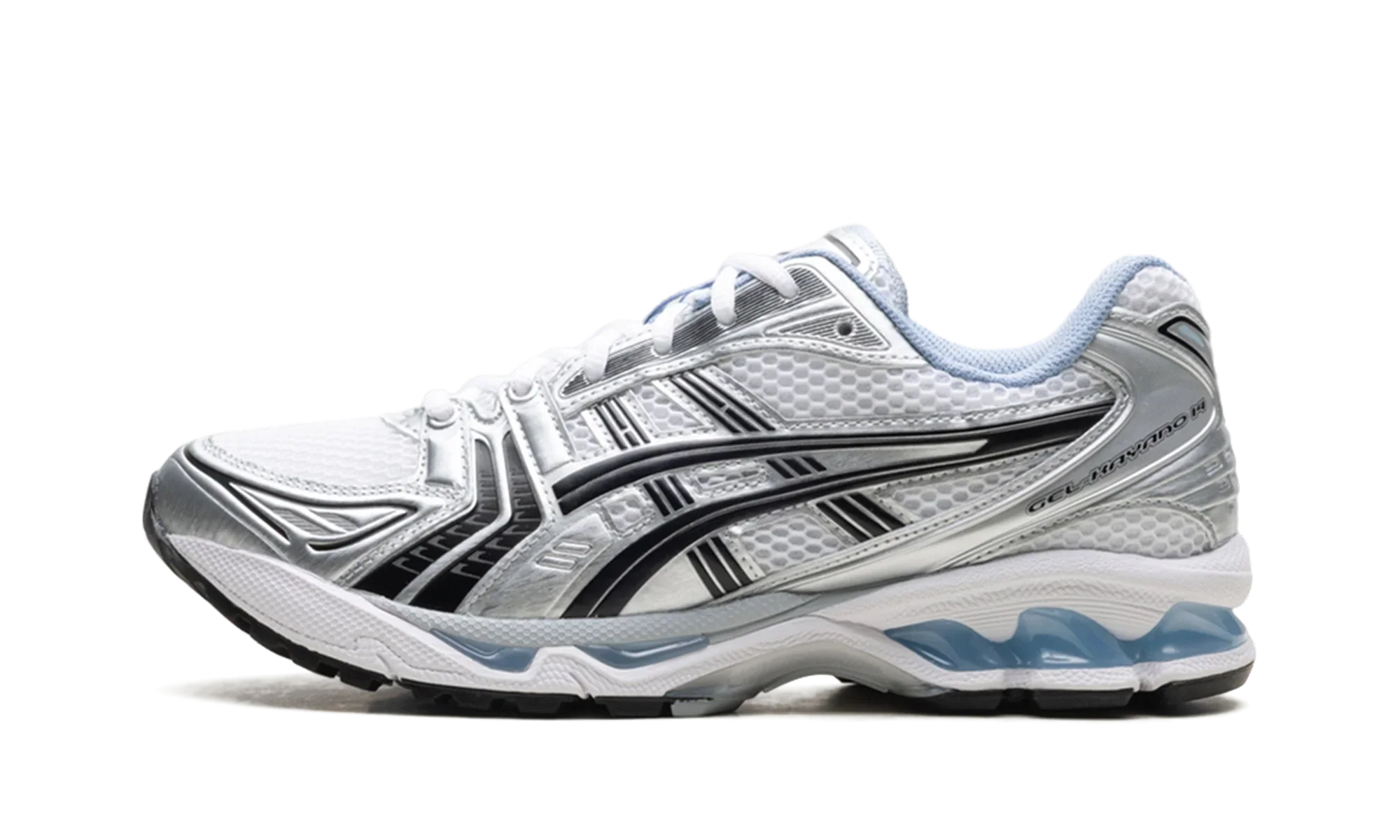 La tige est construite autour d’un mesh blanc respirant « White » avec des superpositions en nubuck gris clair « Neutral Grey ». La languette, le lining et les inserts GEL arborent une nuance douce de Baby Blue, insufflant une touche pastel délicate à l’ensemble et accentuant le relief technique emblématique du Kayano 14.
