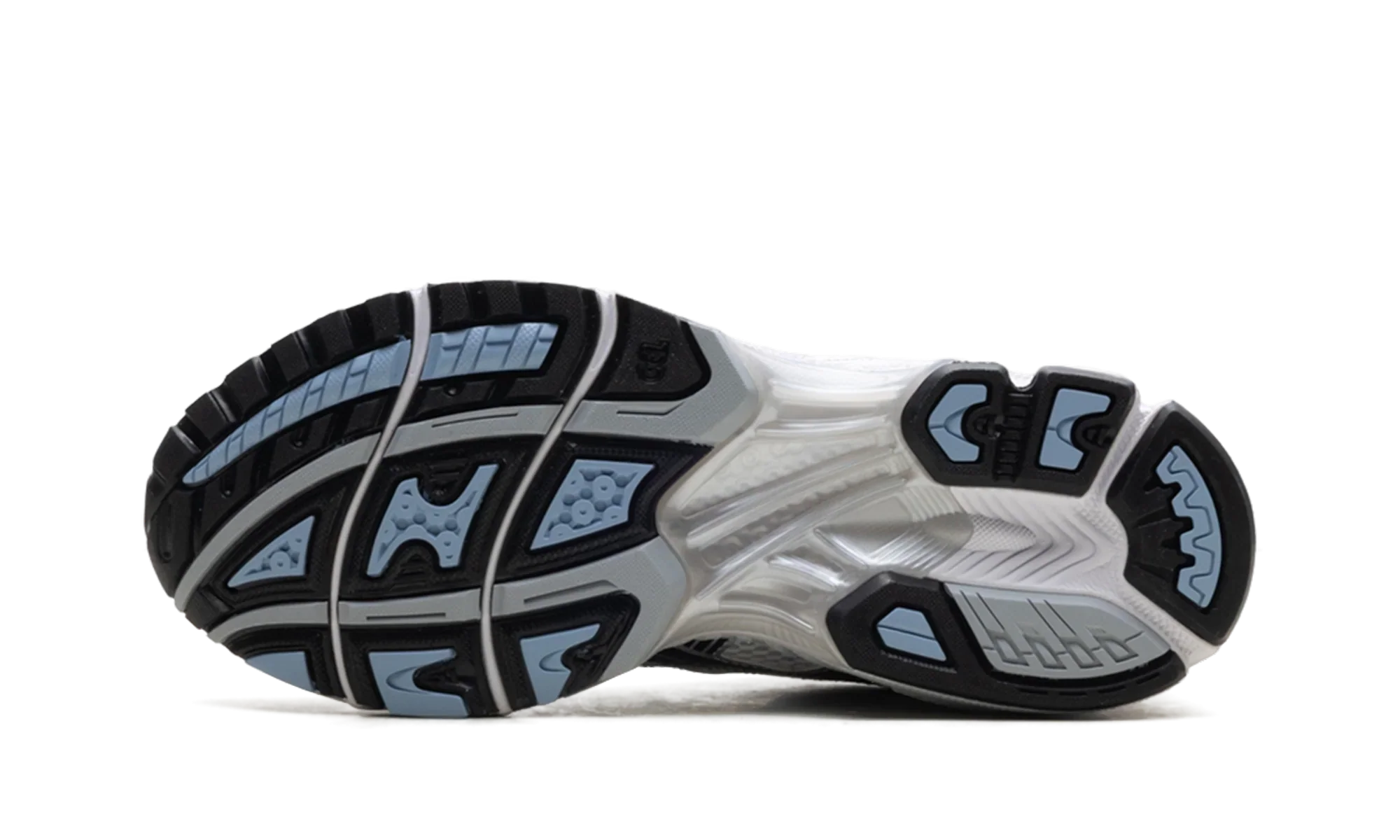 La semelle intermédiaire se pare d’un blanc légèrement crémé, intégrant des unités GEL à l’avant-pied et au talon pour un amorti durable. En complément, la semelle extérieure combine gris clair et bleu discret pour offrir adhérence et cohérence chromatique raffinée.