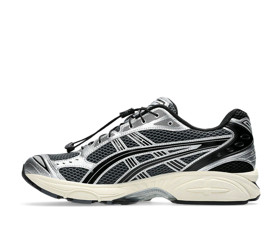 La ASICS Gel‑Kayano 14 Carrier Grey, pièce phare de l’« Unlimited Pack », redéfinit le mix entre sportif et lifestyle. Dotée d’une tige en mesh charbon, renforcée de superpositions synthétiques argentées et de velours suédé sobres, elle est dotée d’un laçage à cordon ajustable pour un look épuré et pratique.