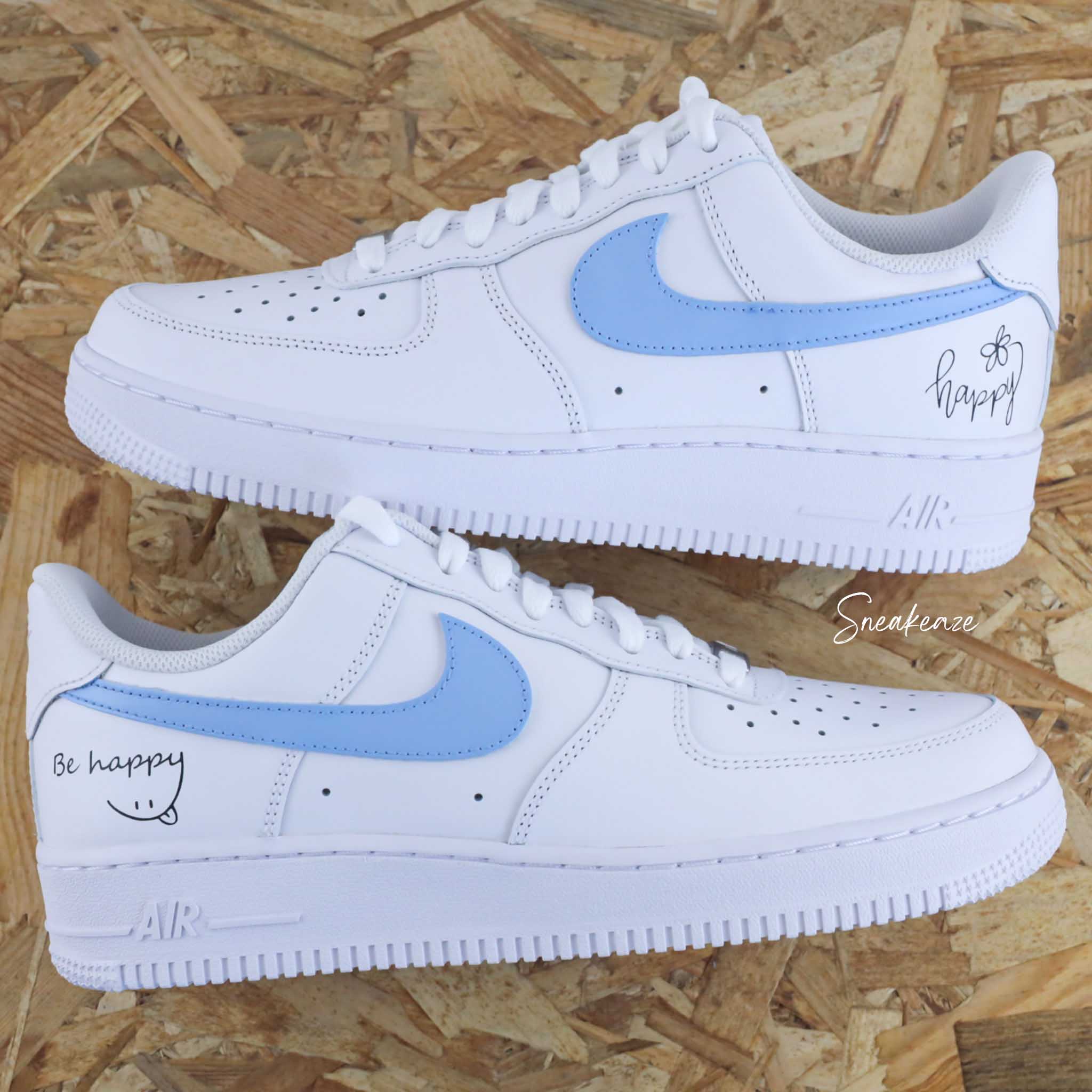 Baskets Nike Air Force 1 custom baby blue et inscription » Happy » sur les côtés extérieurs.