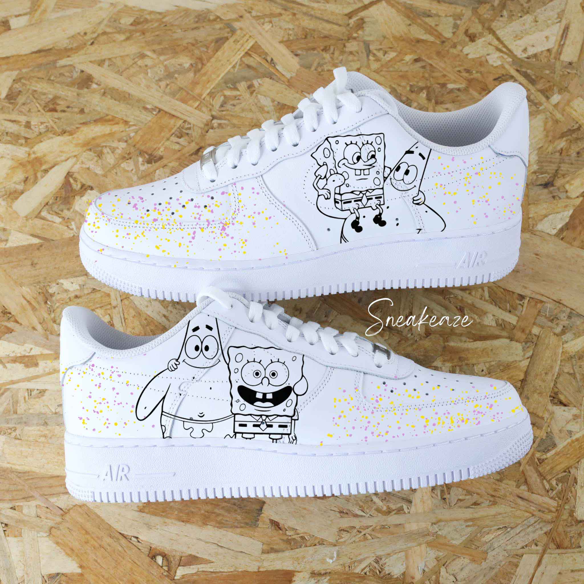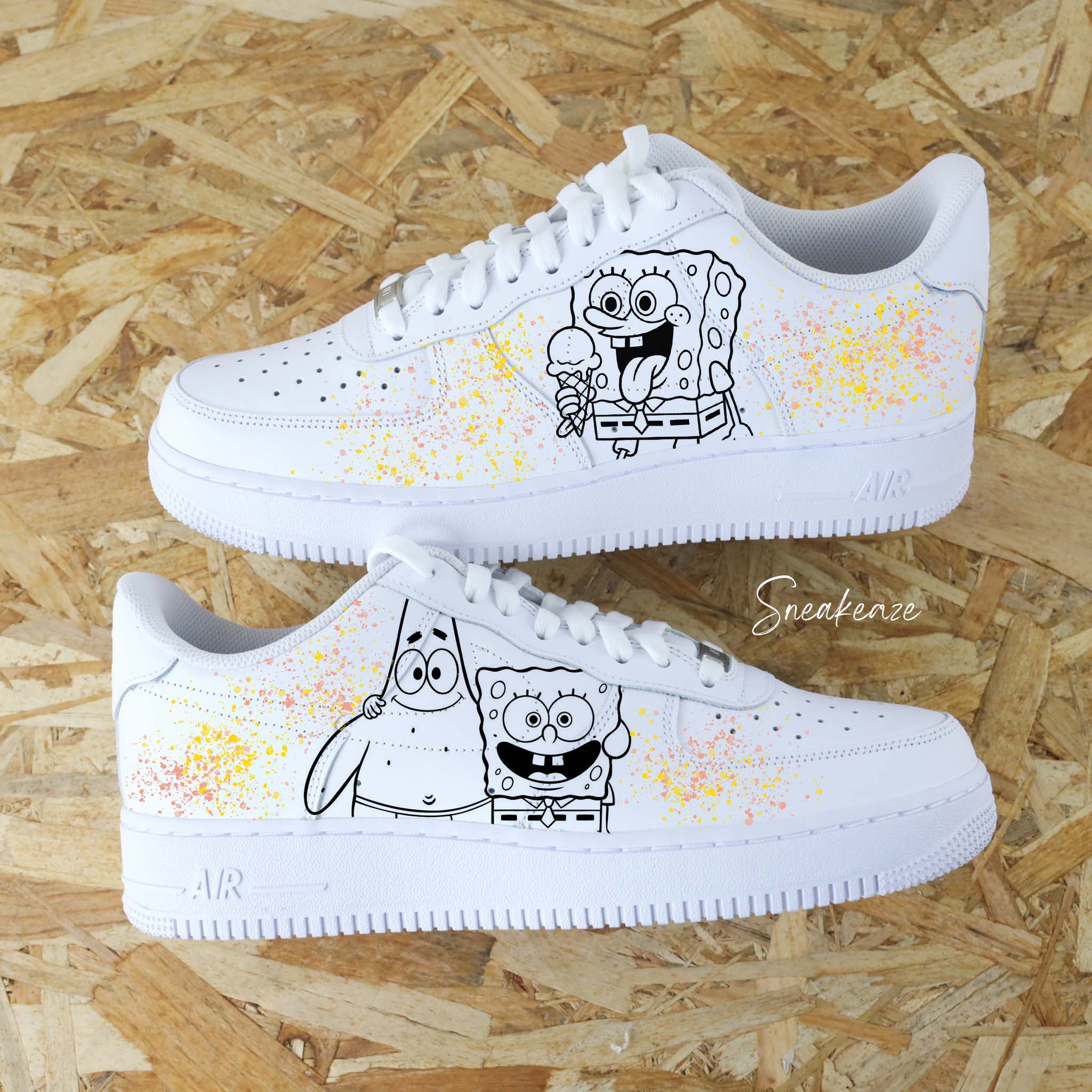 Baskets Nike Air force 1 custom dessins peint à la main de Bob l’éponge et Patrick l’étoile de mer sur les côtés extérieurs avec splash. Je souhaite ajouter un prénom à mon custom Modèle fait-main dans notre atelier, peinture waterproof. Le tarif comprend la paire ainsi que la customisation.