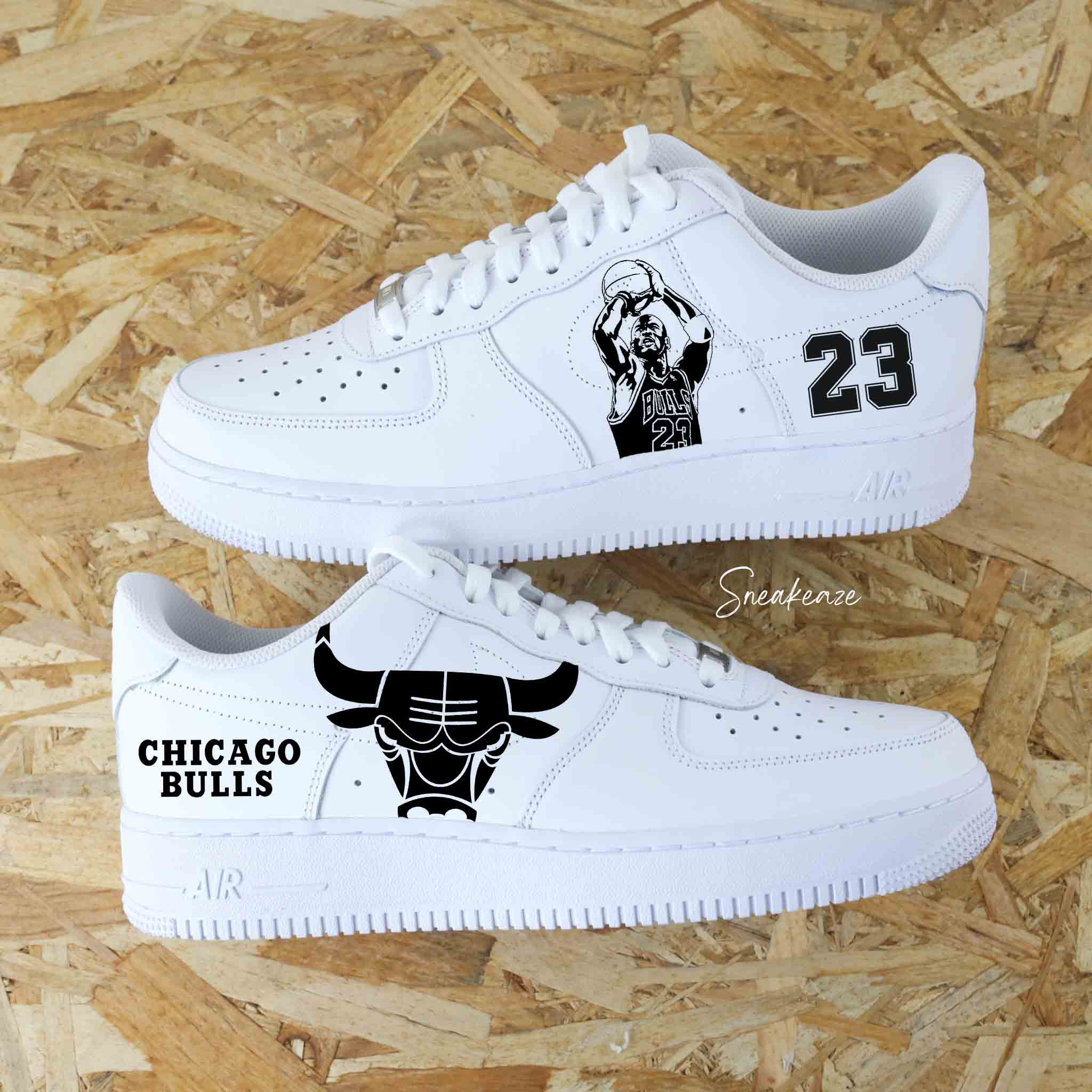 Baskets Nike Air force 1 custom modèle Bulls. Motifs peints sur les côtés extérieurs. Je souhaite ajouter un prénom à mon custom Modèle fait-main dans notre atelier, peinture waterproof. Le tarif comprend la paire ainsi que la customisation.