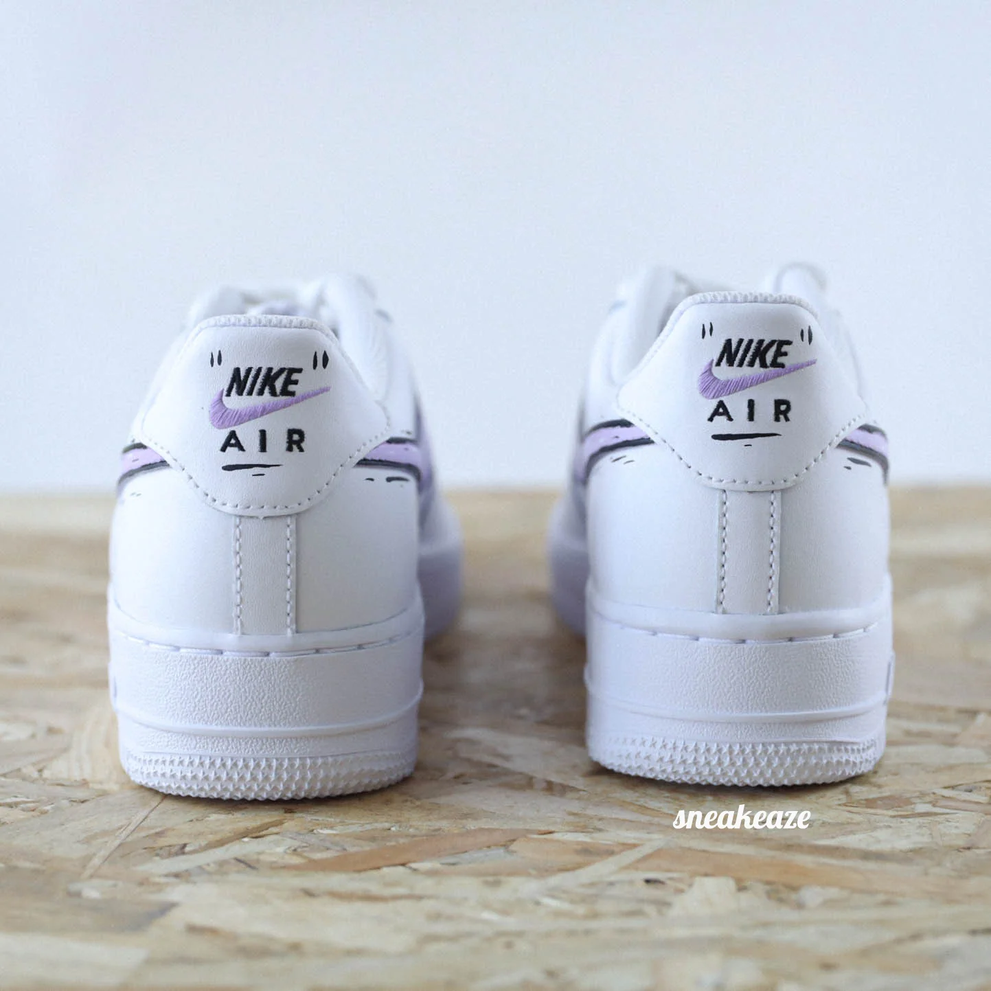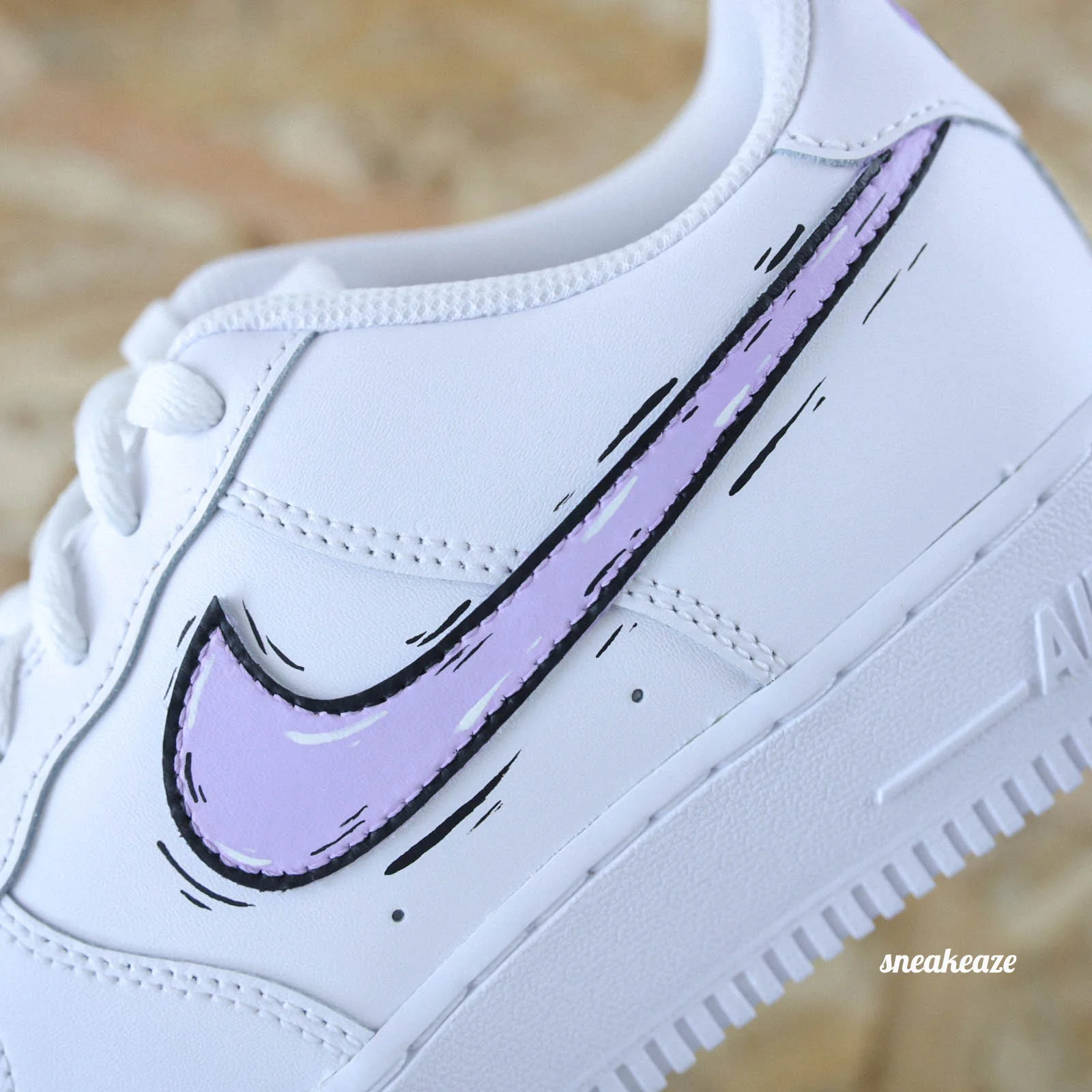 Baskets Nike Air Force 1 custom Cartoon swoosh couleur Lila clair. Je souhaite ajouter un prénom à mon custom Modèle fait-main dans notre atelier, peinture waterproof. Le tarif comprend la paire ainsi que la customisation.