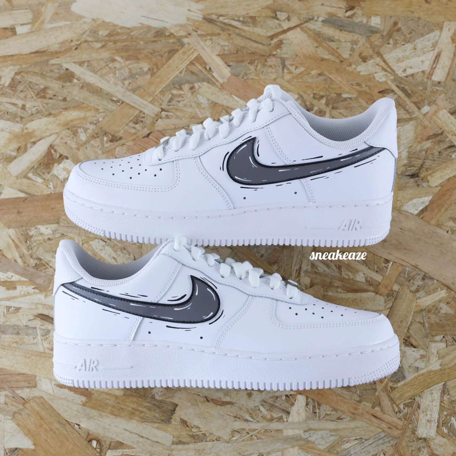 Baskets Nike Air Force 1 custom Cartoon swoosh couleur gris. Je souhaite ajouter un prénom à mon custom Modèle fait-main dans notre atelier, peinture waterproof. Le tarif comprend la paire ainsi que la customisation.
