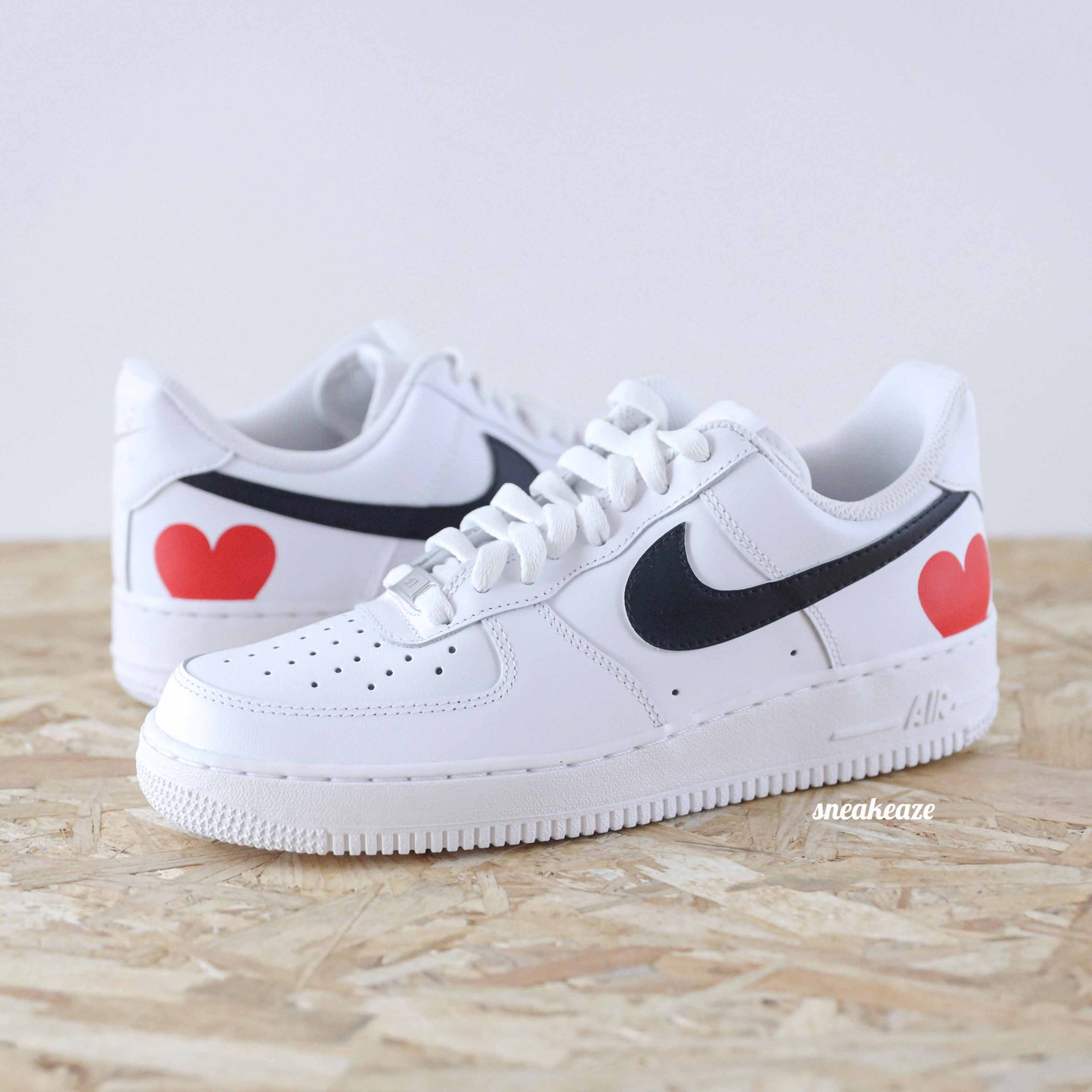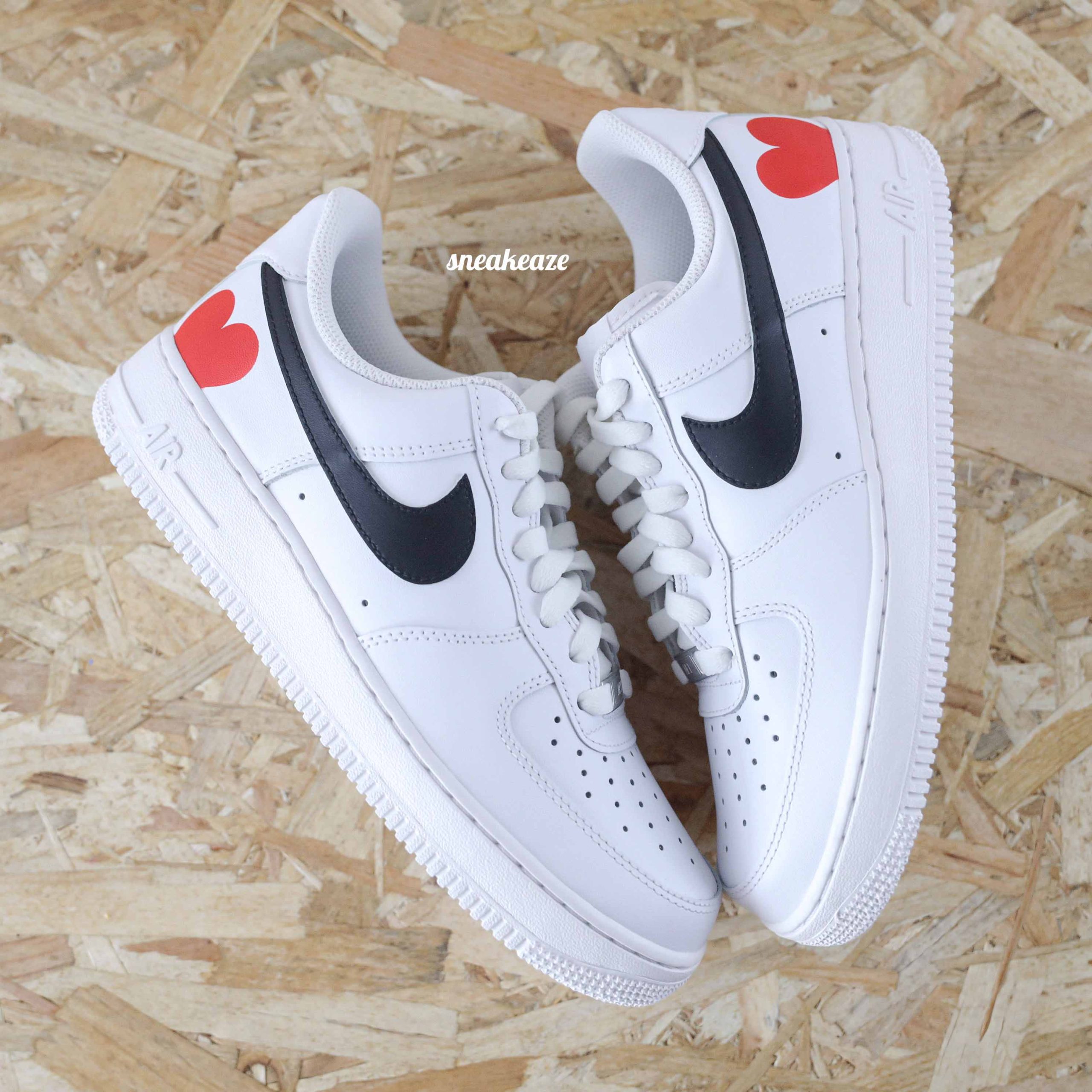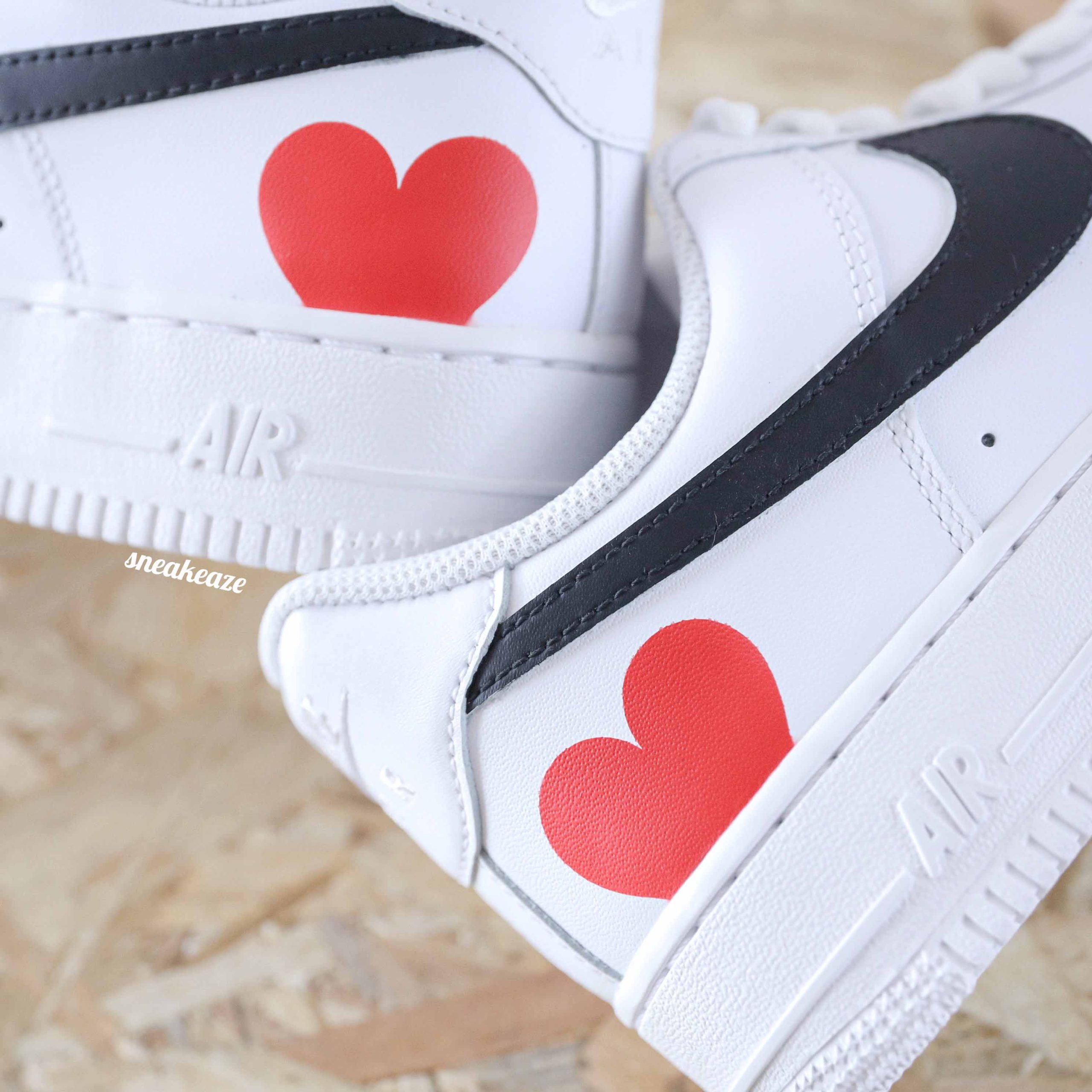Baskets Nike Air Force 1 custom swoosh et coeur. Motif coeur sur côtés extérieurs. Je souhaite ajouter un prénom à mon custom