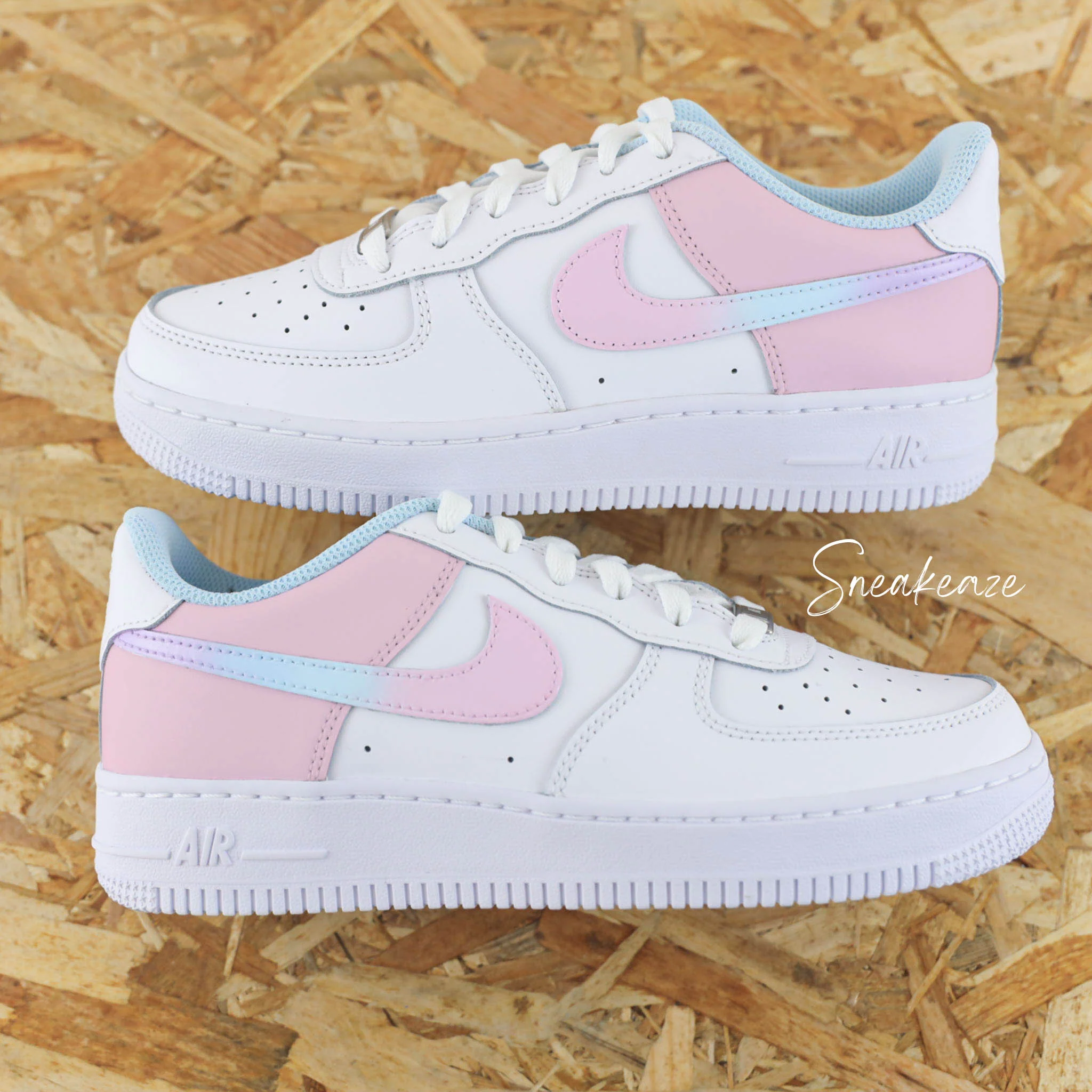 Basket Nike Air force 1 custom color block pastel. Signes Nike peint sur les 4 cotés dégradé bleu rose et lila.