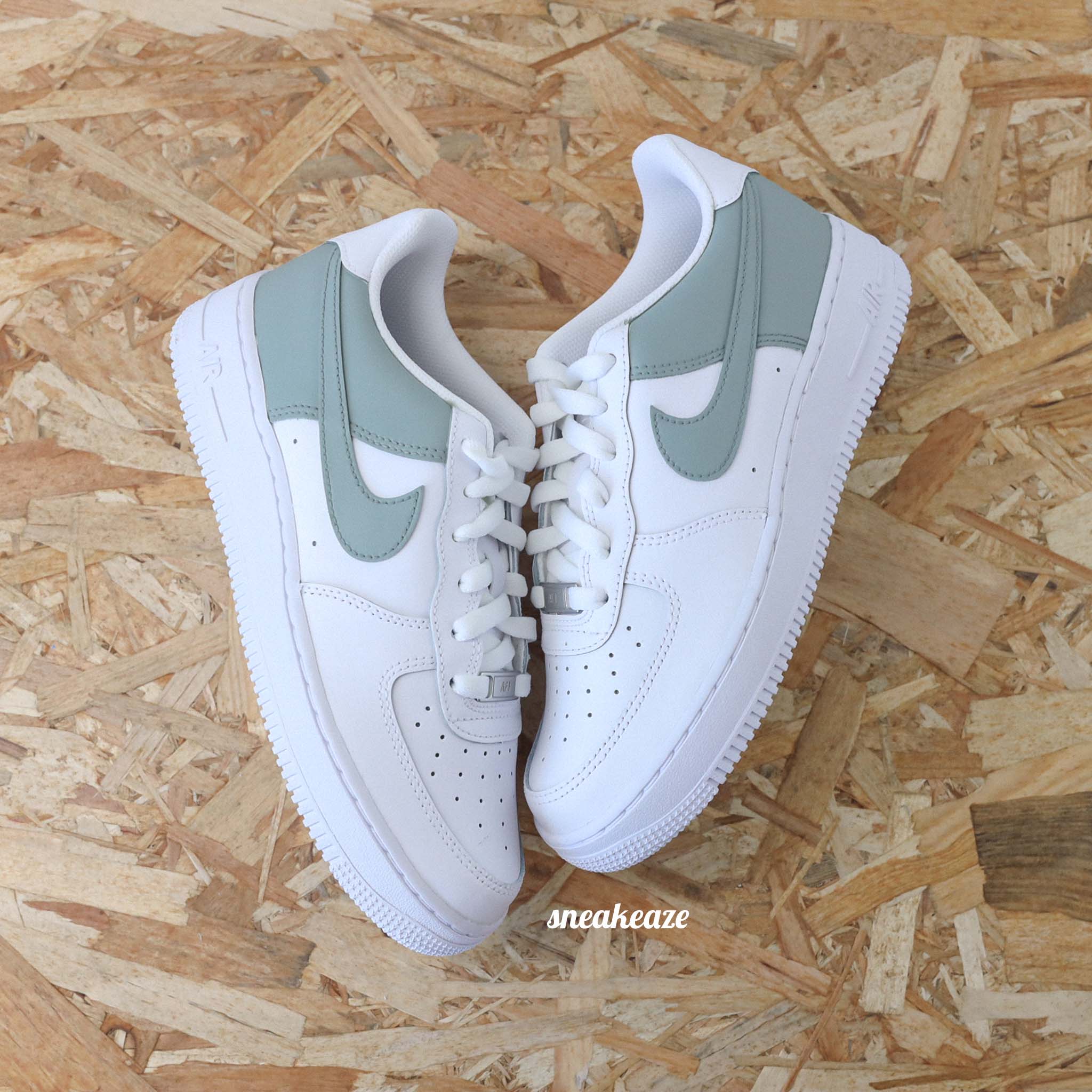 Baskets Nike Air Force 1 custom modèle color block couleur vert de gris. Je souhaite ajouter un prénom à mon custom Modèle fait-main dans notre atelier, peinture waterproof. Custom sur les côtés intérieurs et extérieurs Le tarif comprend la paire ainsi que la customisation.