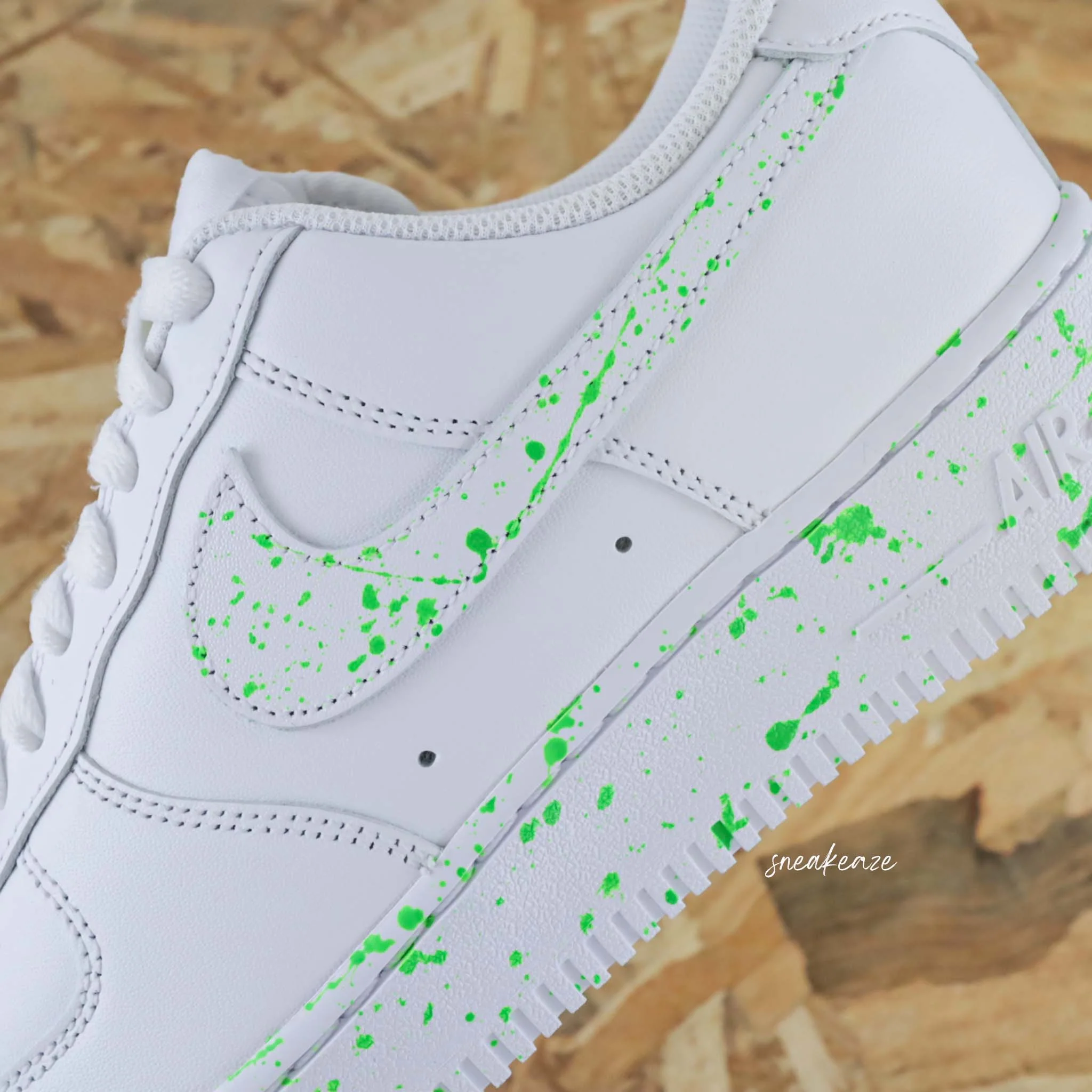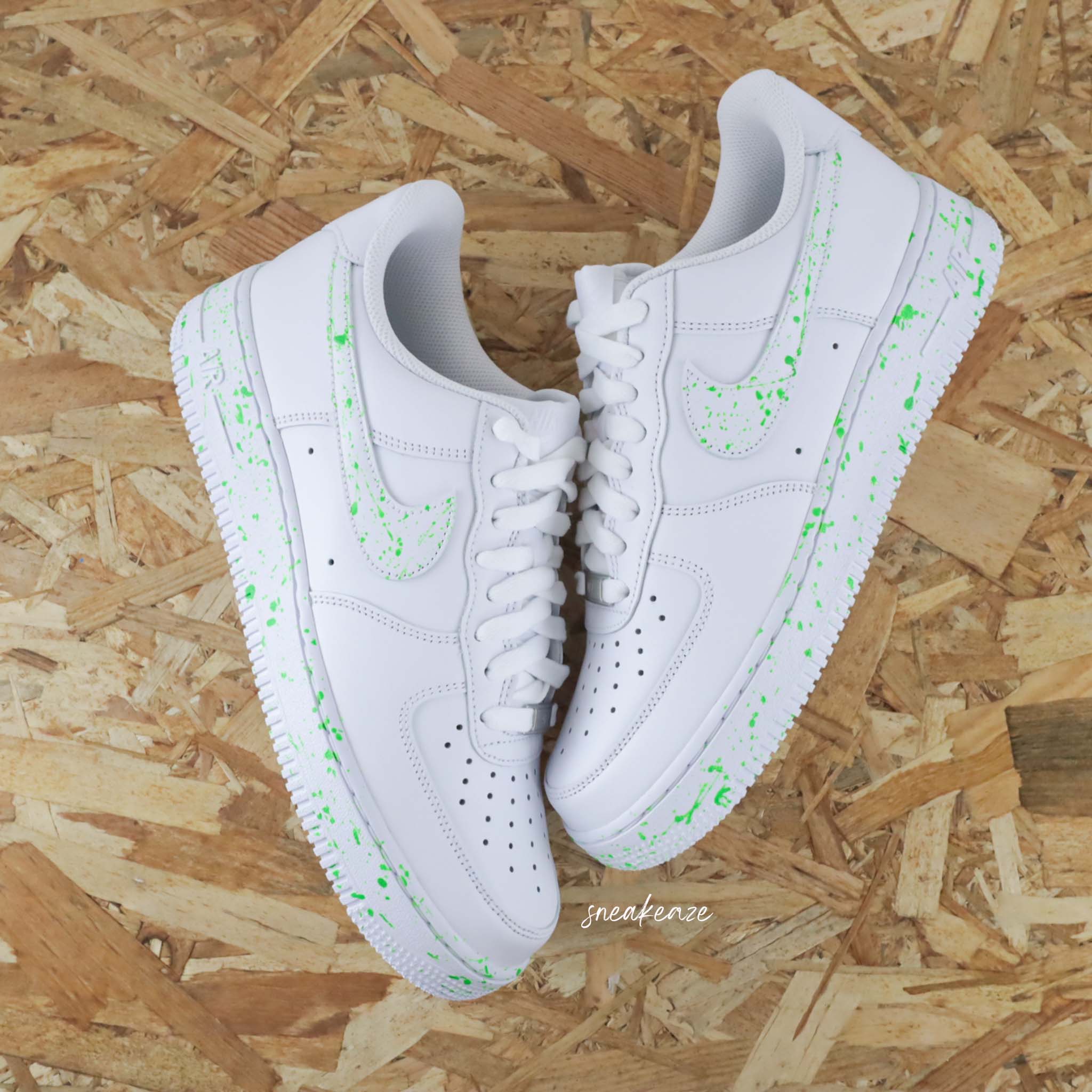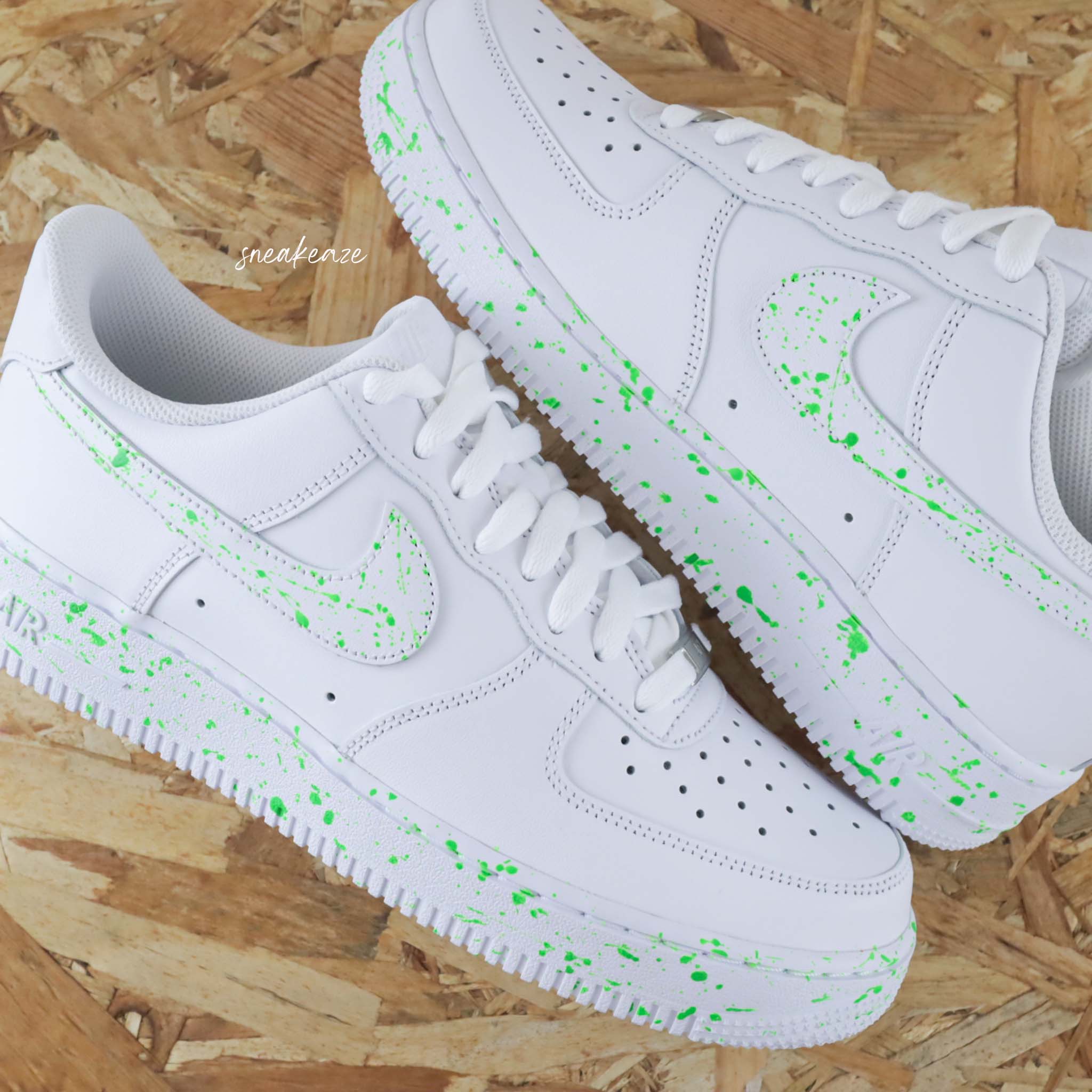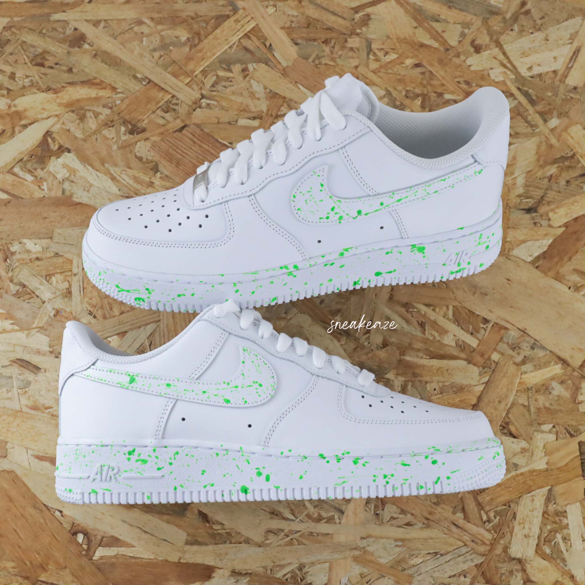 Baskets Nike air force 1 custom – splash neon green. Je souhaite ajouter un prénom à mon custom Modèle fait-main dans notre atelier, peinture waterproof. Le tarif comprend la paire ainsi que la customisation.