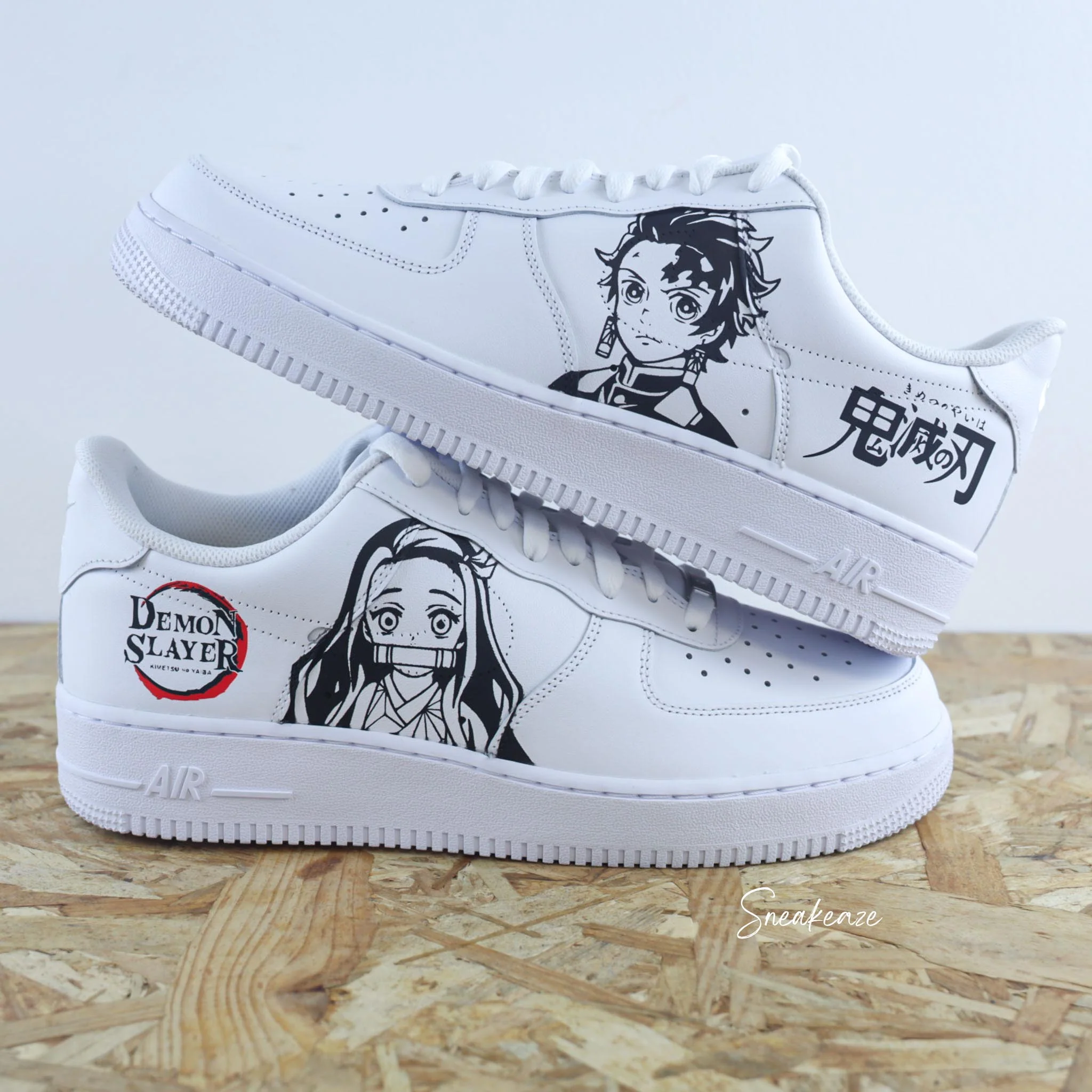 Baskets Nike Air force 1 custom dessin Demon Slayer sur côtés extérieurs. Je souhaite ajouter un prénom à mon custom Modèle fait-main dans notre atelier, peinture waterproof. Le tarif comprend la paire ainsi que la customisation.