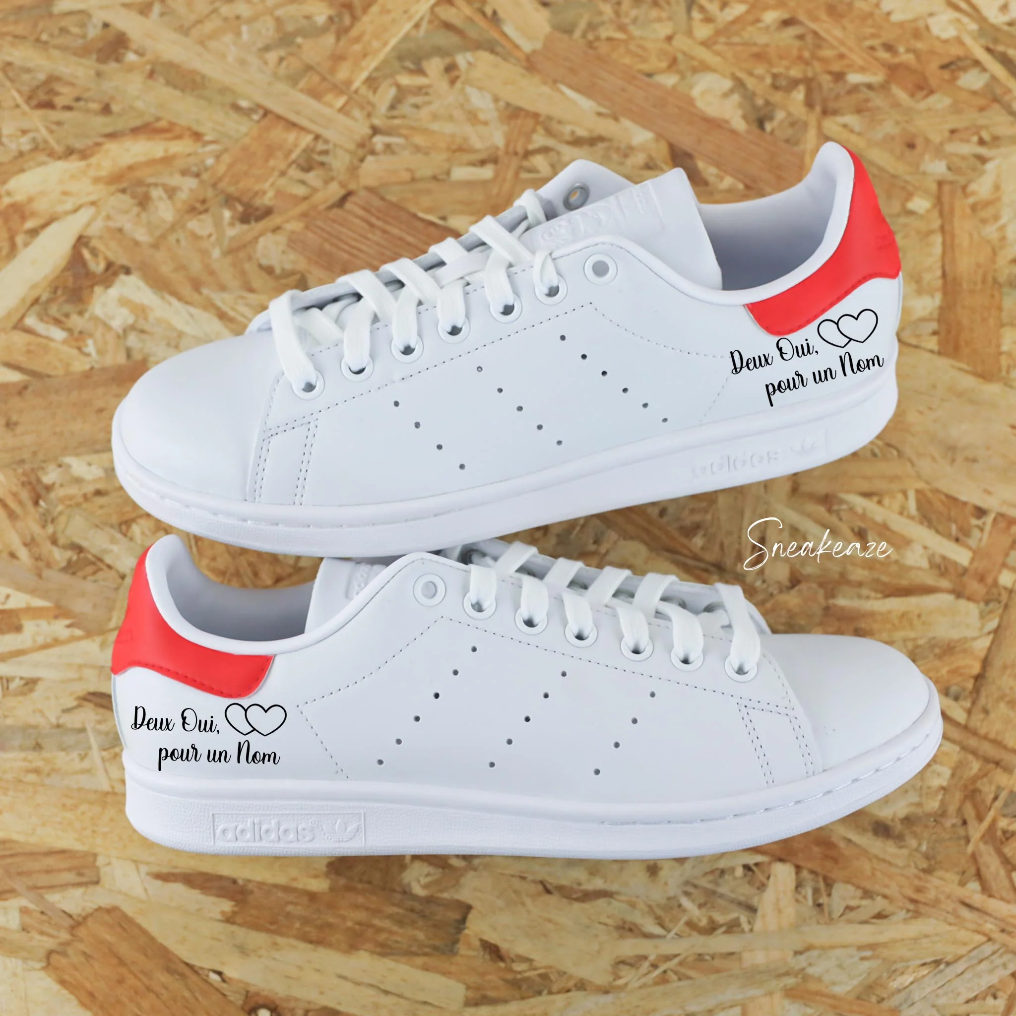 Basket Adidas Stan smith custom talon peint à la main + inscription « Deux oui pour un Nom » sur les côtés extérieurs. Modèle fait-main dans notre atelier, peinture waterproof. Le tarif comprend la paire ainsi que la customisation.