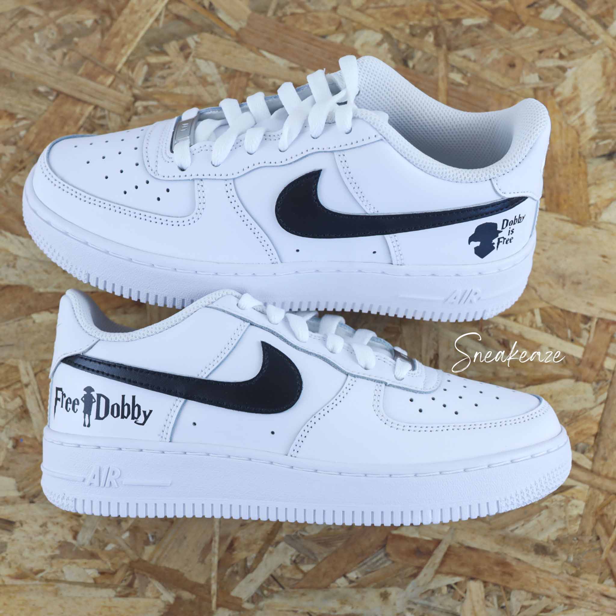 Basket Nike Air force 1 custom motifs Dobby d’Harry potter sur côtés extérieurs. Je souhaite ajouter un prénom à mon custom Modèle fait-main dans notre atelier, peinture waterproof. Le tarif comprend la paire ainsi que la customisation.