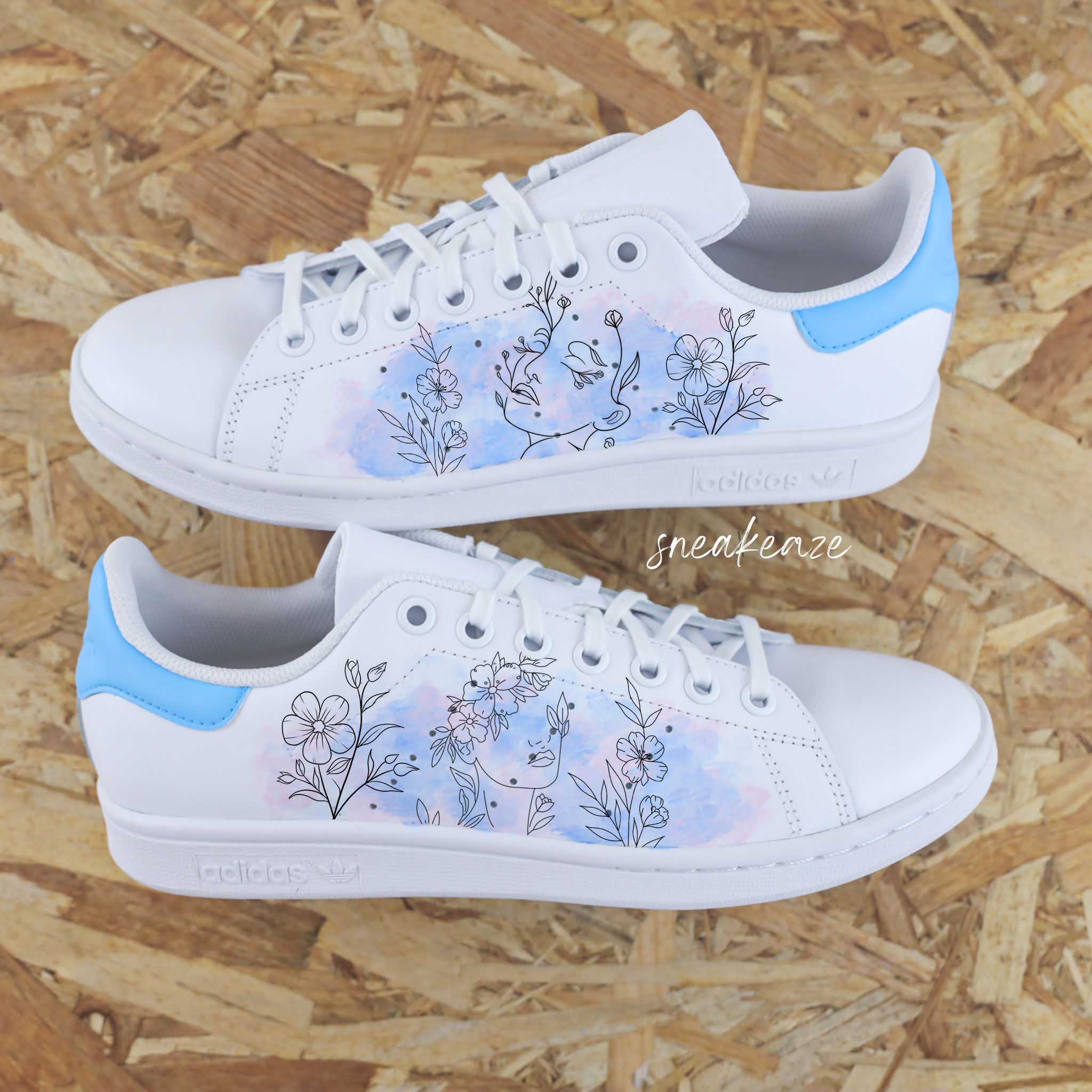 Baskets Adidas Stan Smith custom dessin fleurs champêtres et effet aquarelle