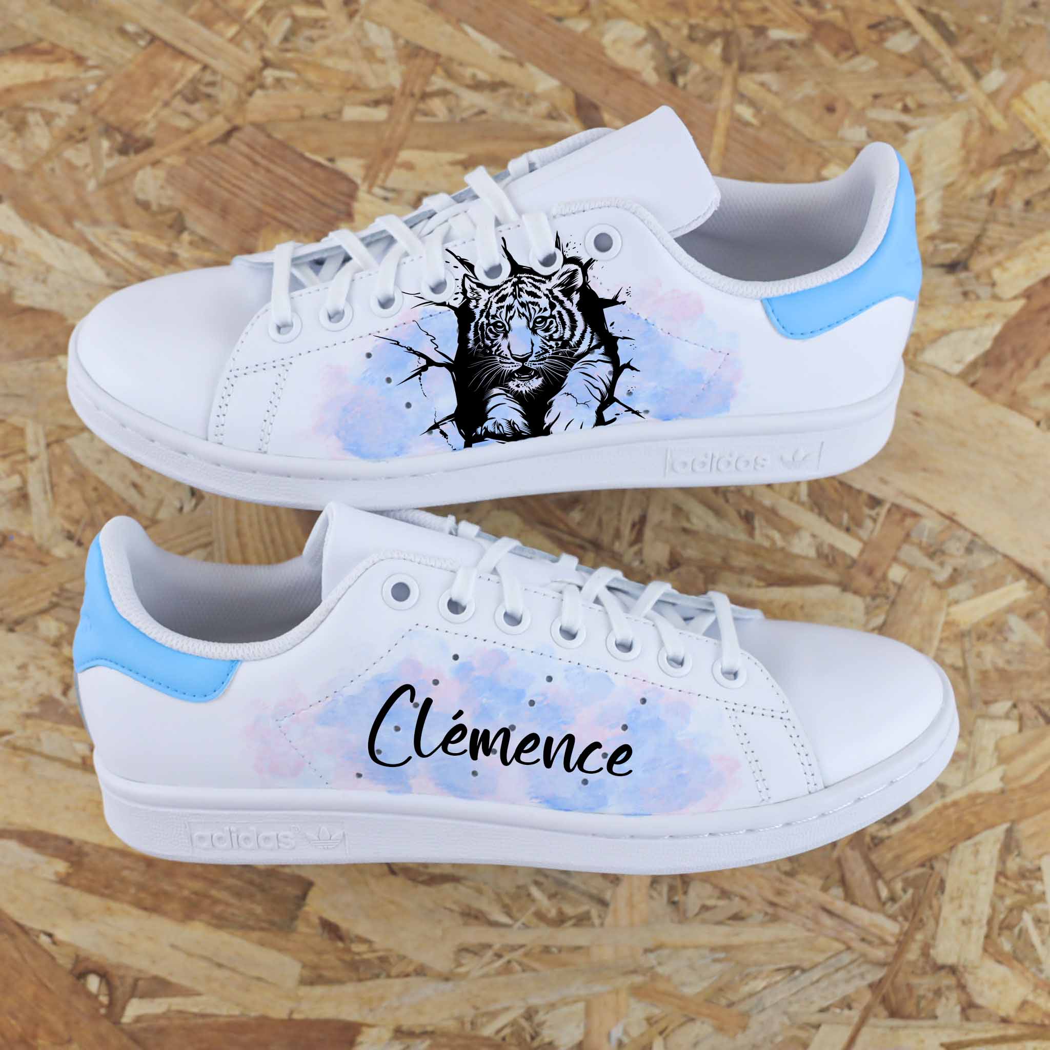 Baskets Adidas Stan Smith custom dessin, inscription prénom et effet aquarelle bleu Modèle fait-main dans notre atelier, peinture waterproof. Le tarif comprend la paire ainsi que la customisation. Je souhaite ajouter un prénom à mon custom
