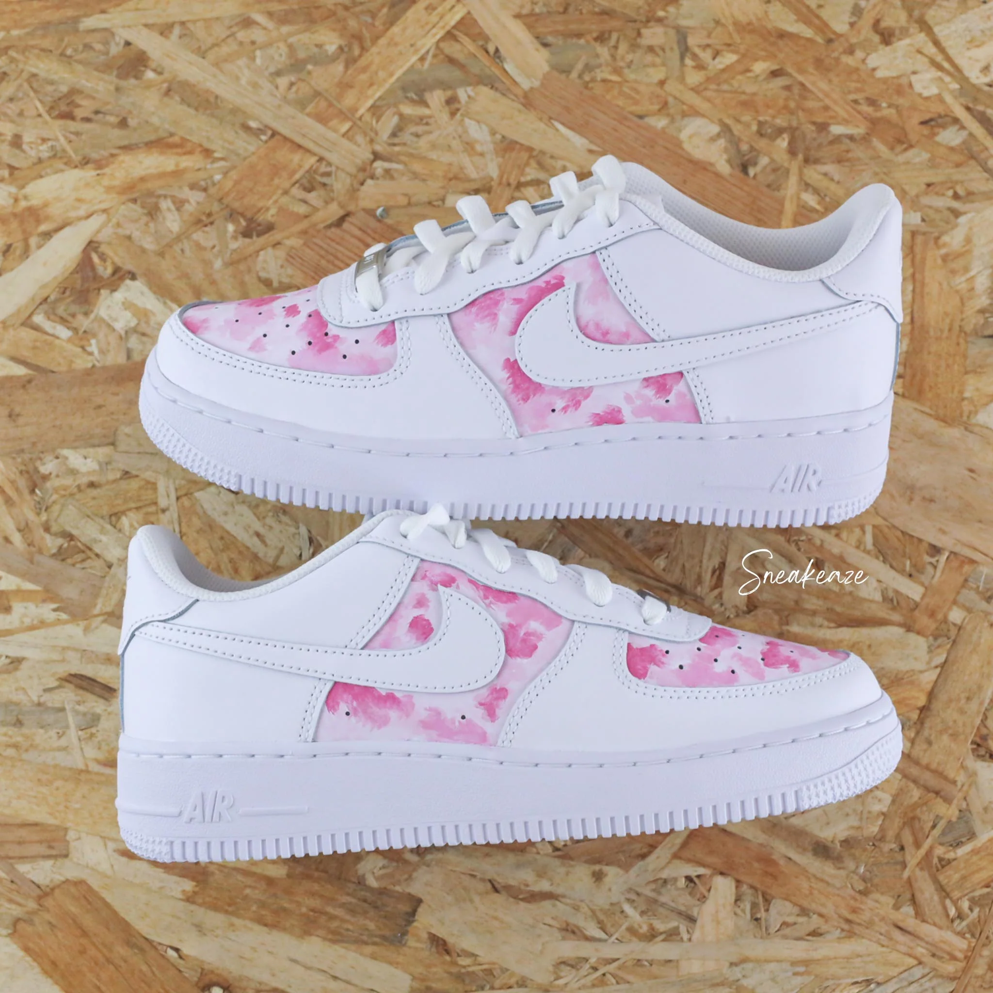 Baskets Nike Air Force 1 custom modèle effet aquarelle brush couleurs rose pastel.