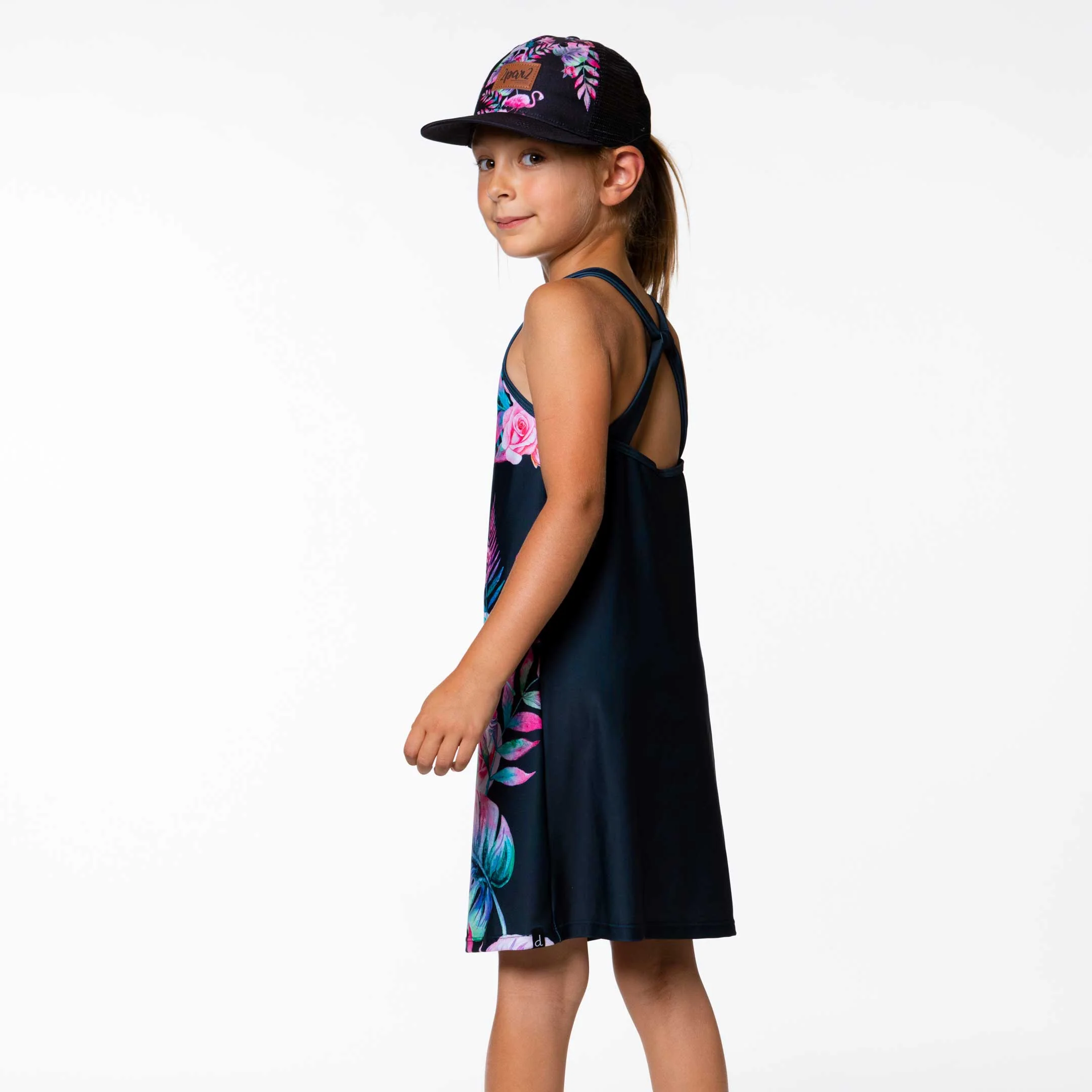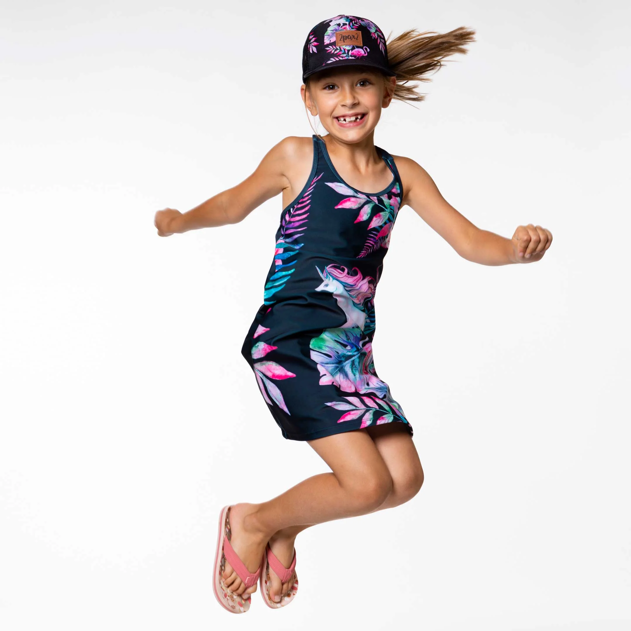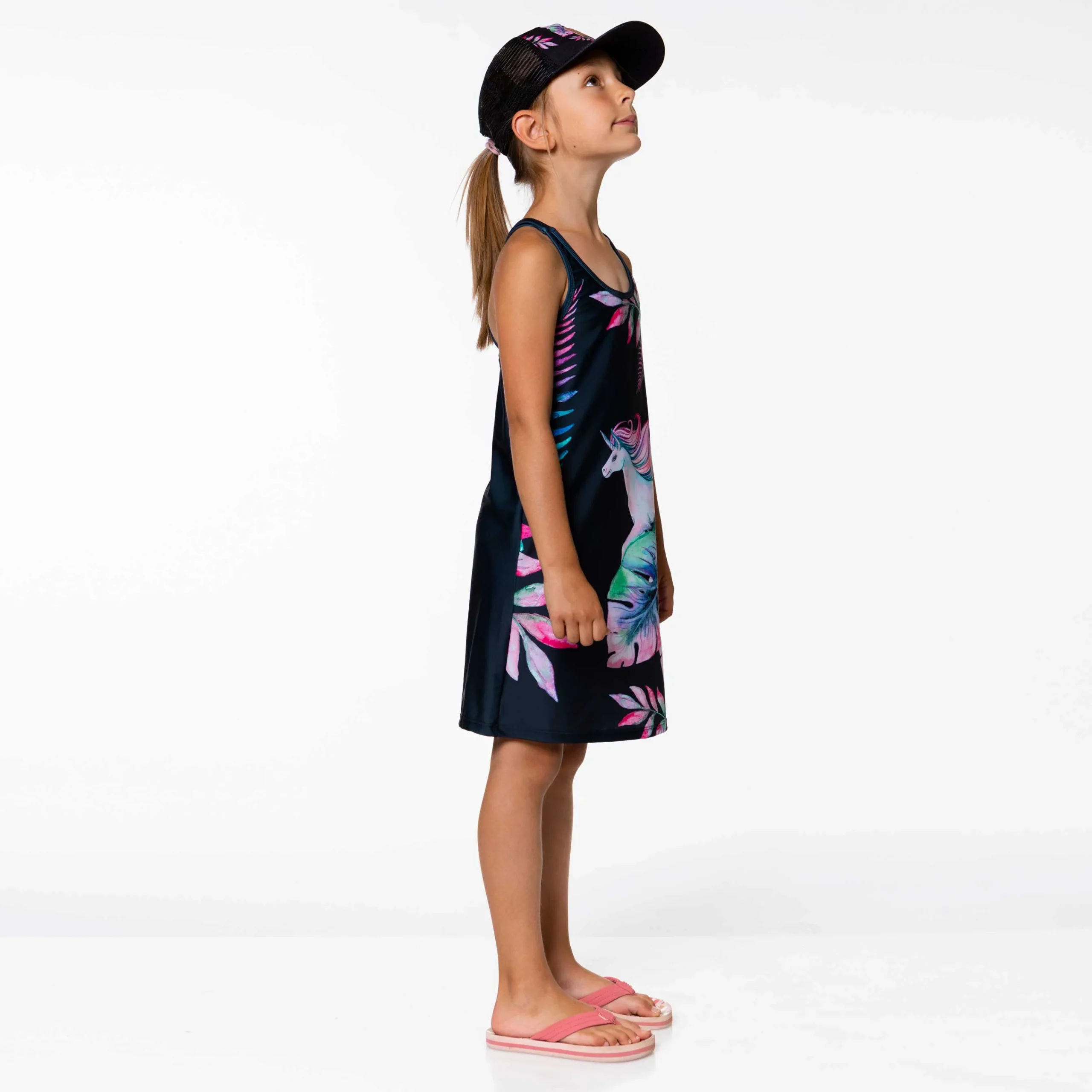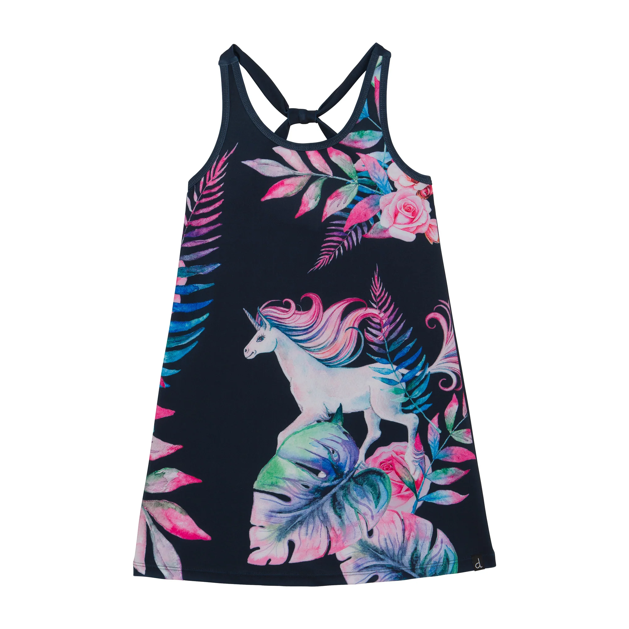 Comme par-dessus de maillot de bain ou comme robe ludique, notre robe de plage licorne est parfaite pour toute journée chaude. Cette robe colorée présente une silhouette sans manches avec un imprimé coloré de licorne et de feuille de palmier et un dos uni avec des bretelles en X.