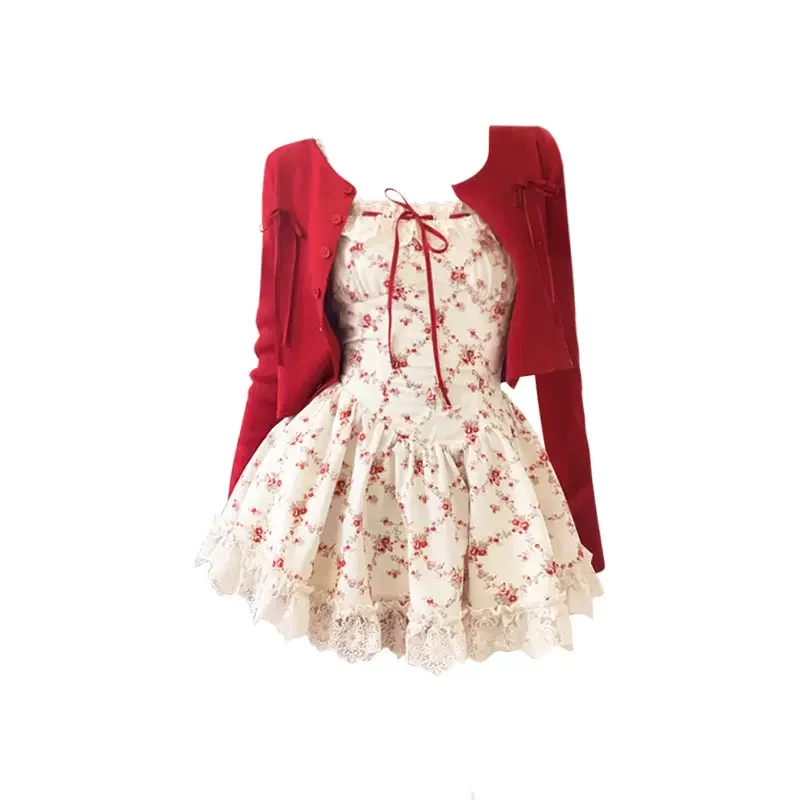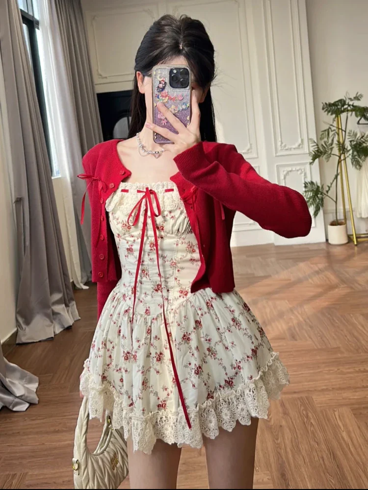 Robe Fleurie et Cardigan Tricoté Rouge