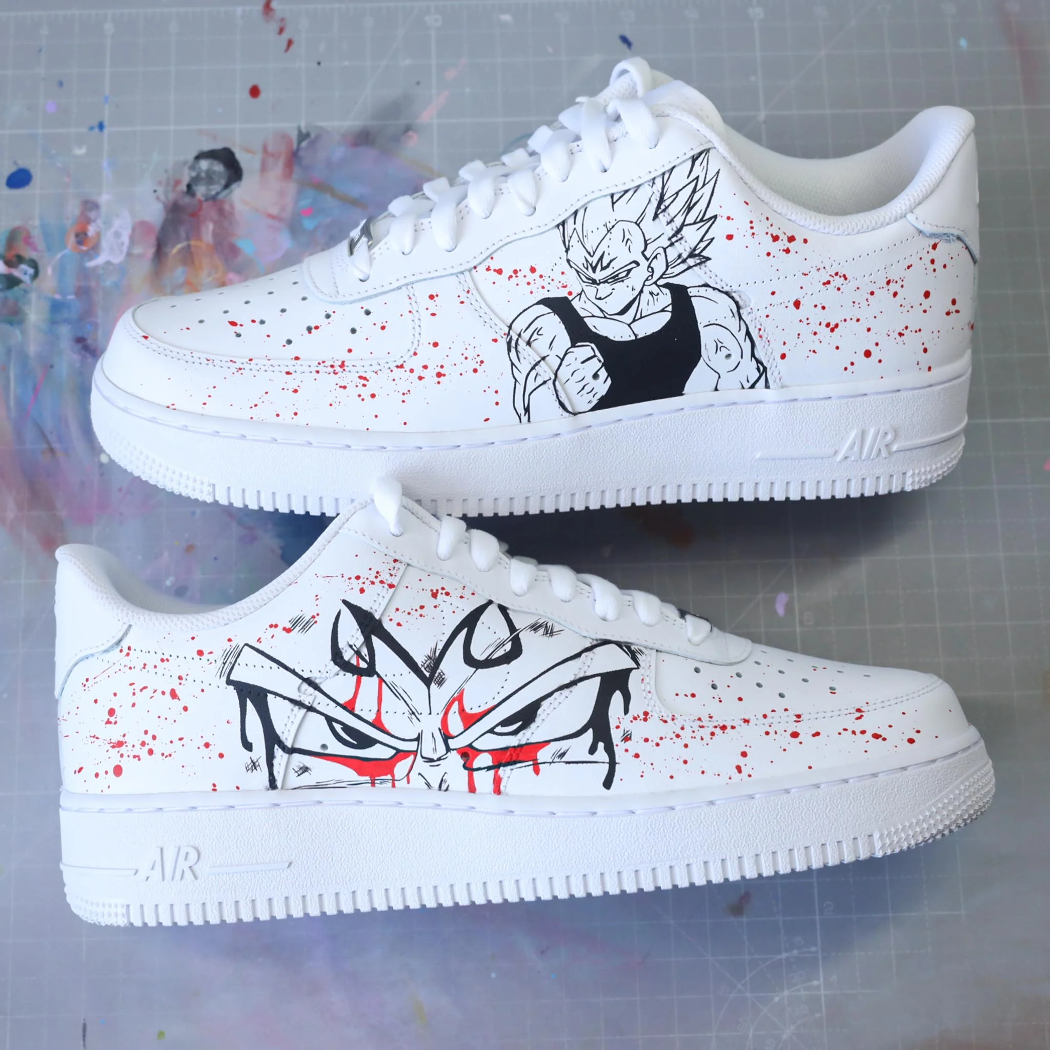 Baskets Nike Air force 1 custom dessin Dragon Ball Z vegeta sur côtés extérieurs. Je souhaite ajouter un prénom à mon custom Modèle fait-main dans notre atelier, peinture waterproof. Le tarif comprend la paire ainsi que la customisation.