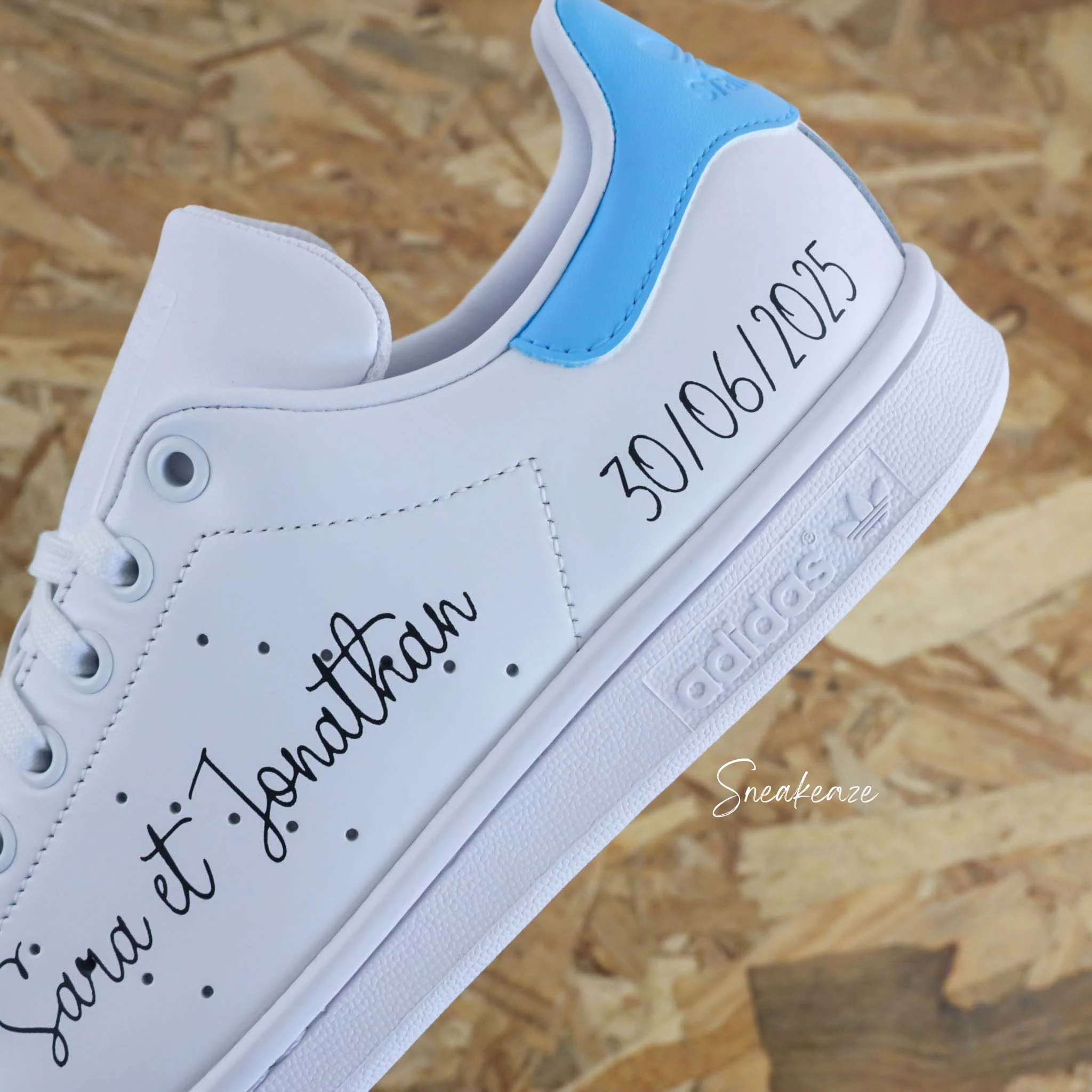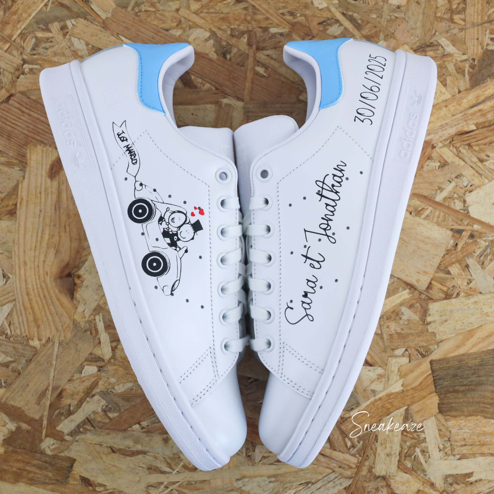 baskets Adidas stan smith custom mariage voiture des mariés – inscription prénoms et date du mariage – talon également peint à la main