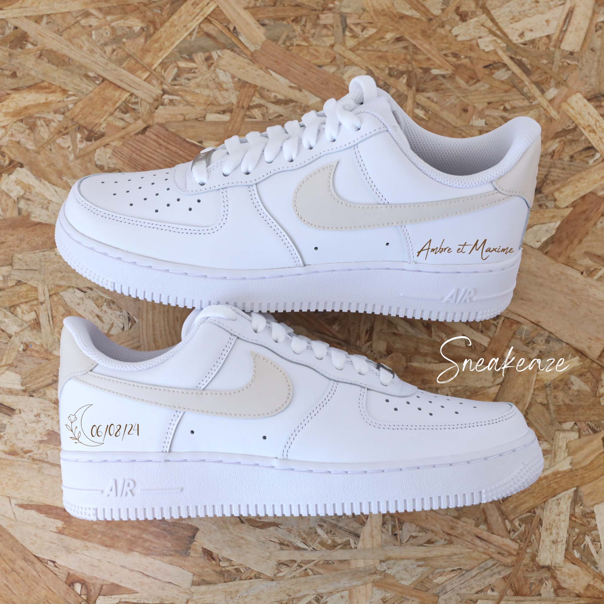 Nike Air Force 1 basses blanches en cuir custom, Démarquez-vous avec une paire de sneakers personnalisable pour votre mariage avec vos prénoms et la date du grand jour à côté du symbole de la lune. Des sneakers qui sortent vraiment de l’ordinaire pour le jour J. Je dis OUI ! wedding day.