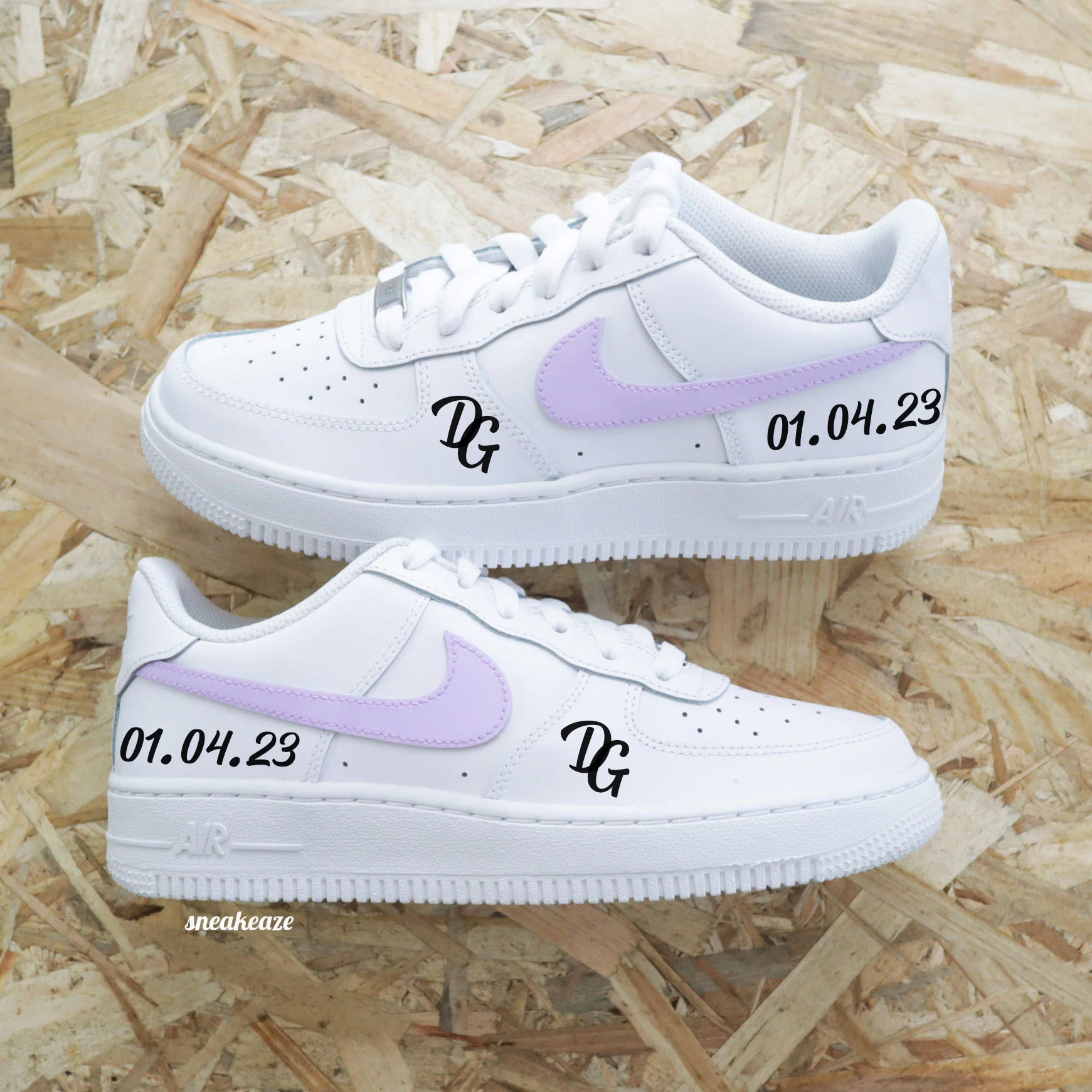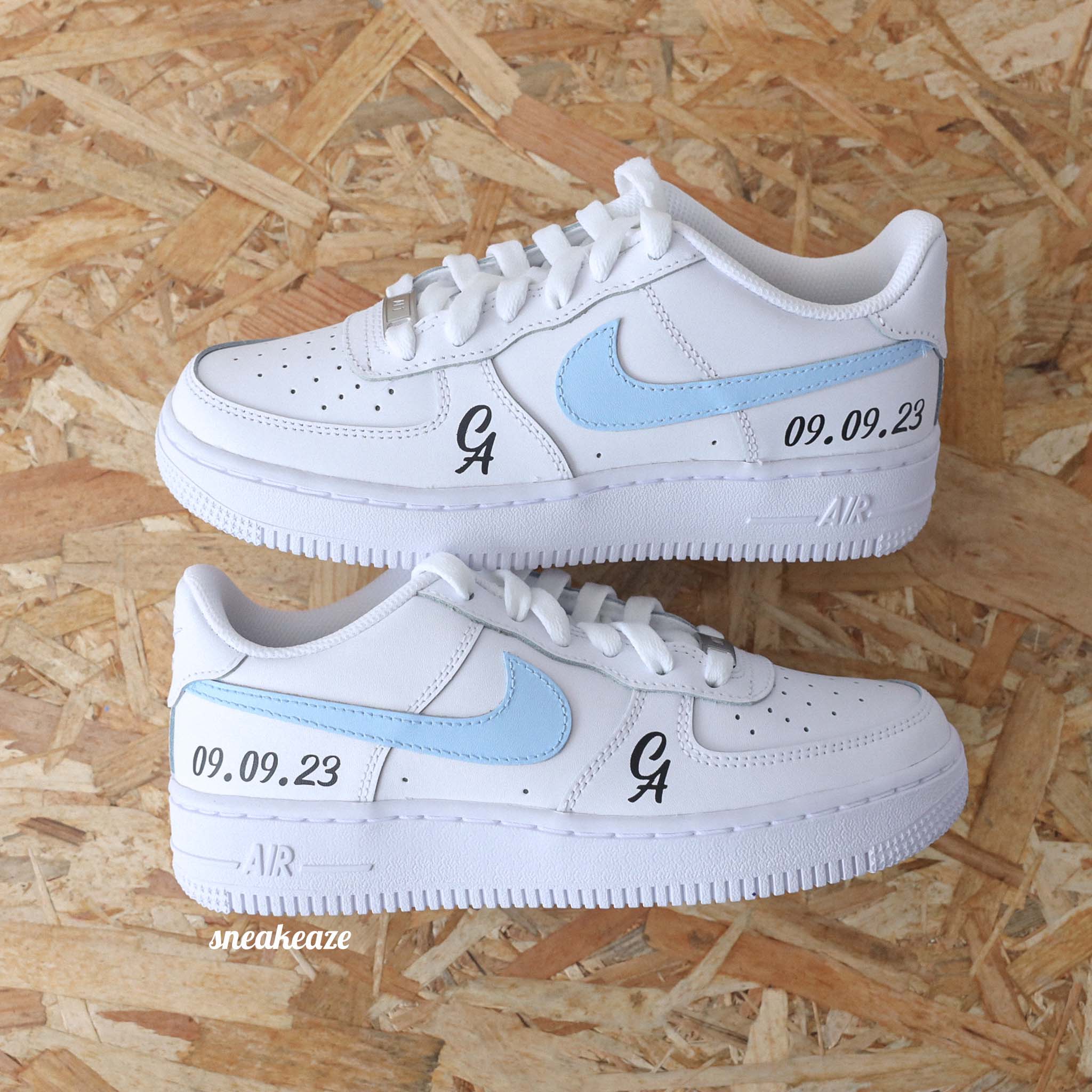 Nike Air Force 1 basses blanches en cuir wedding shoes. Démarquez-vous avec une paire de sneakers personnalisable pour votre mariage avec l’inscription de votre date de mariage et de vos deux initiales. Une paire de baskets qui sort vraiment de l’ordinaire pour le jour J. Je dis OUI !