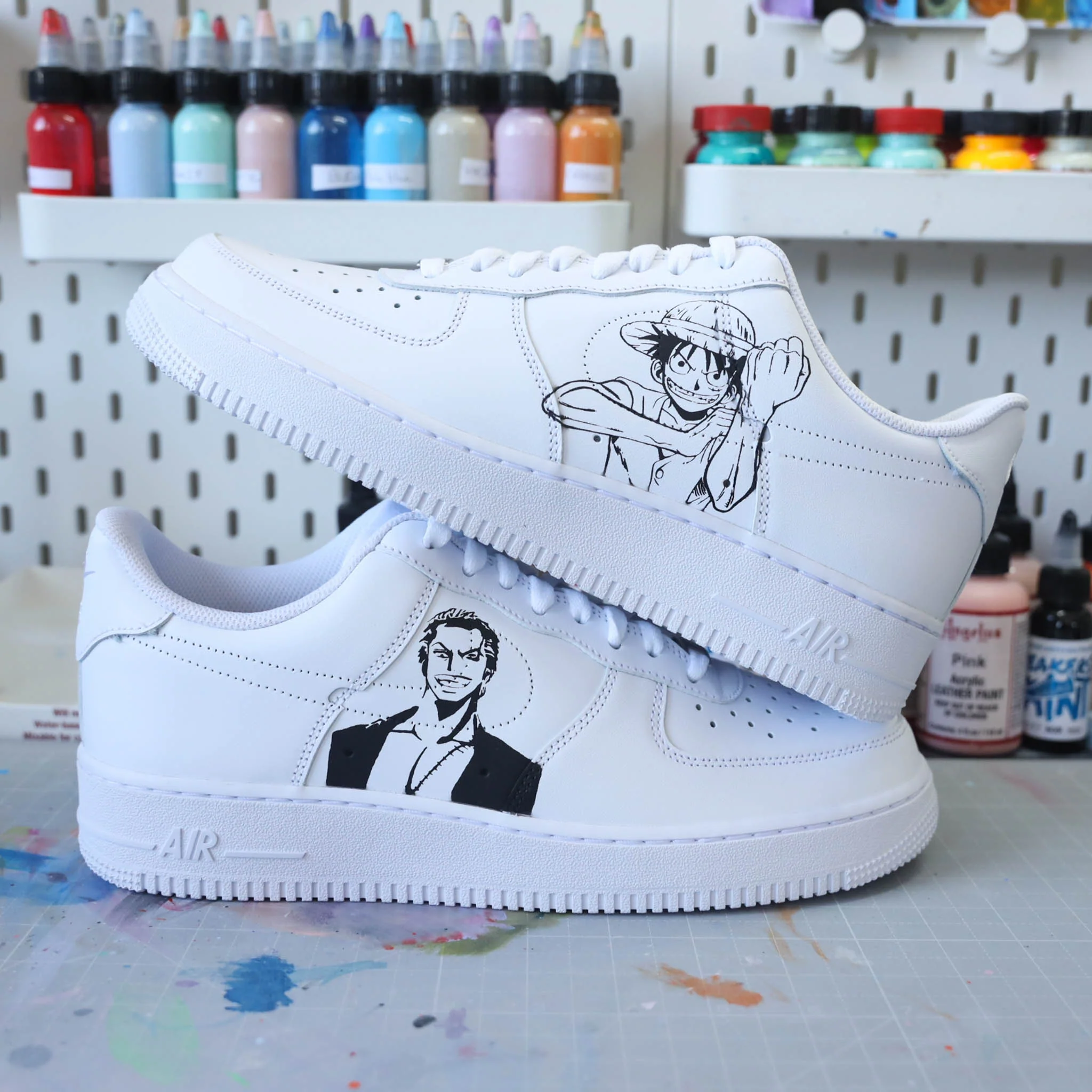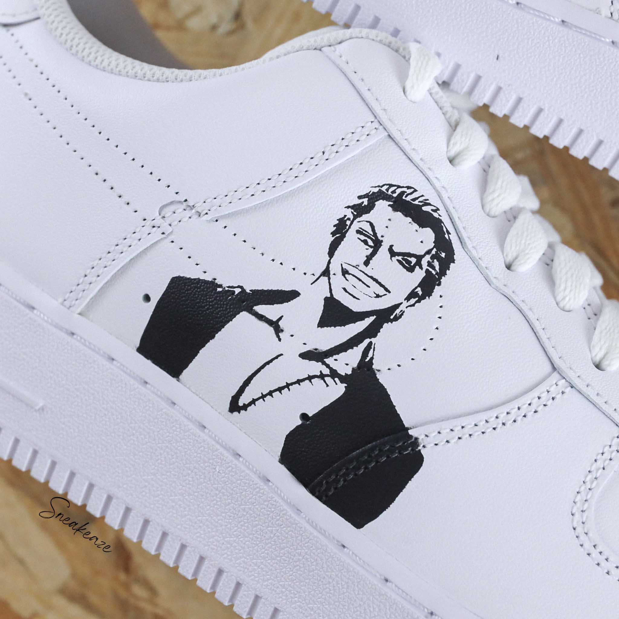 Baskets Nike Air force 1 custom motifs One piece sur côtés extérieurs. Je souhaite ajouter un prénom à mon custom Modèle fait-main dans notre atelier, peinture waterproof. Le tarif comprend la paire ainsi que la customisation.